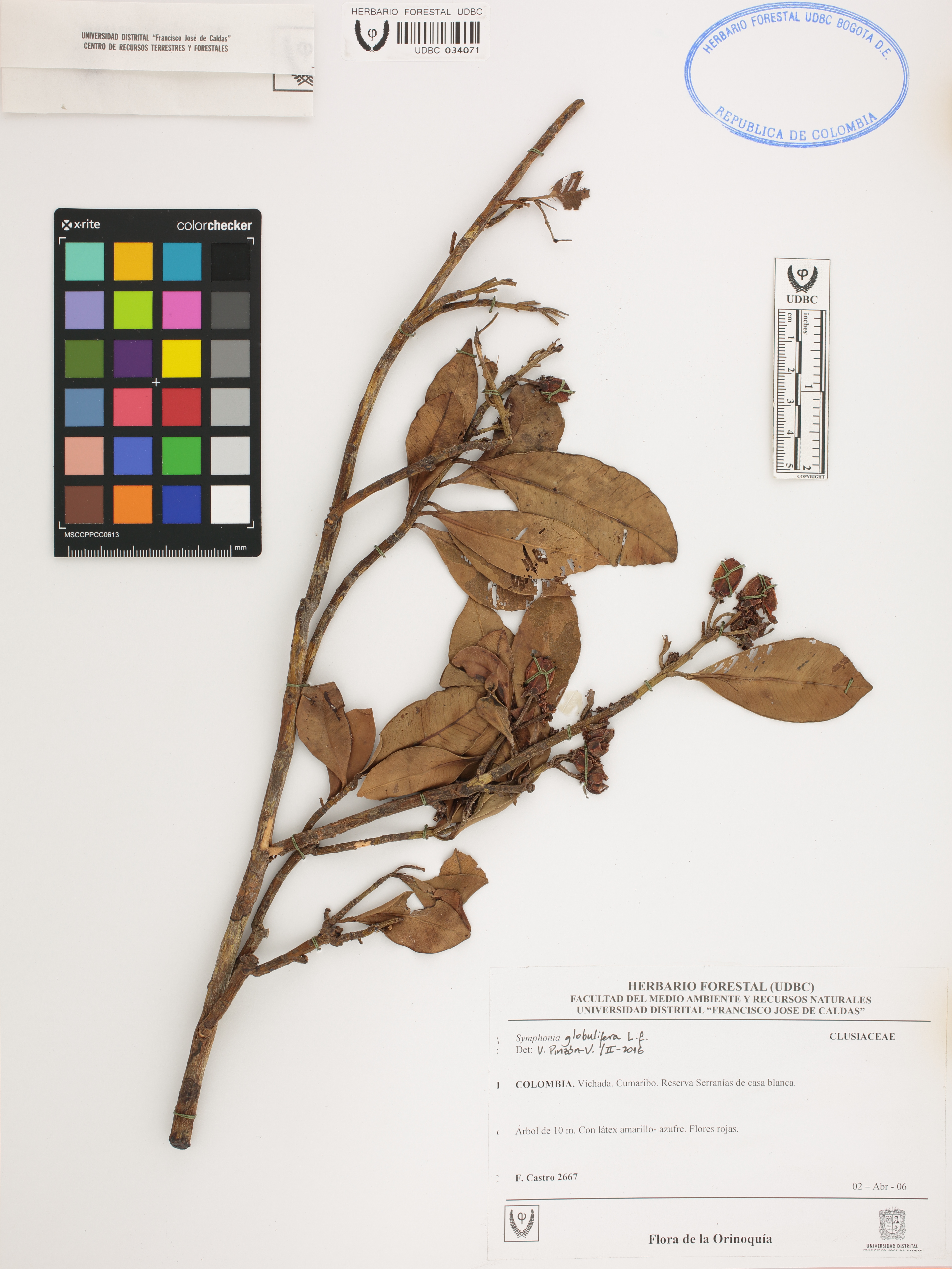 Fotografía del ejemplar Castro, F. 2667, determinado como Symphonia globulifera en el año 2016