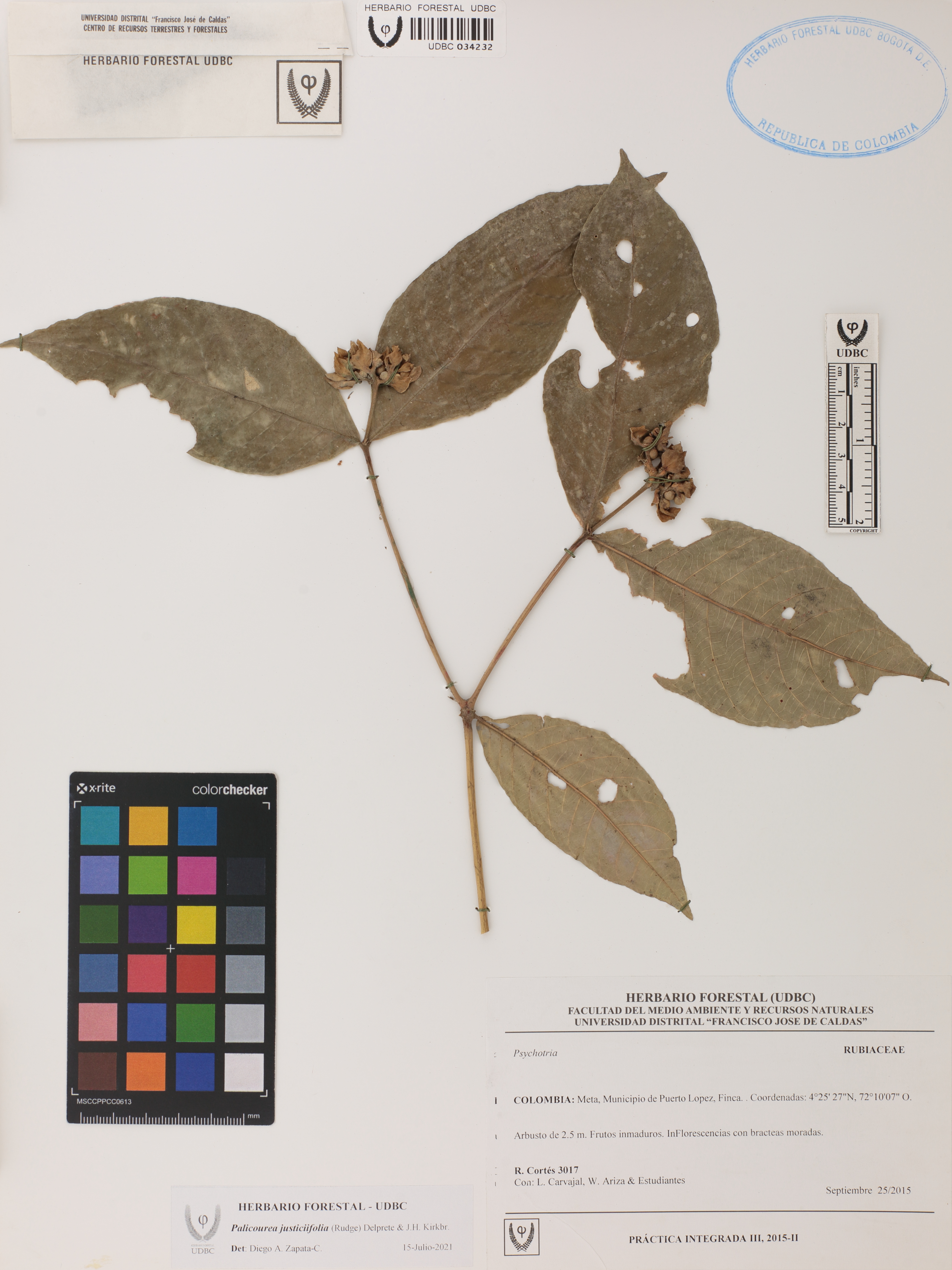 Fotografía del ejemplar Cortés, R. 3017, determinado como Palicourea justiciifolia en el año 2021