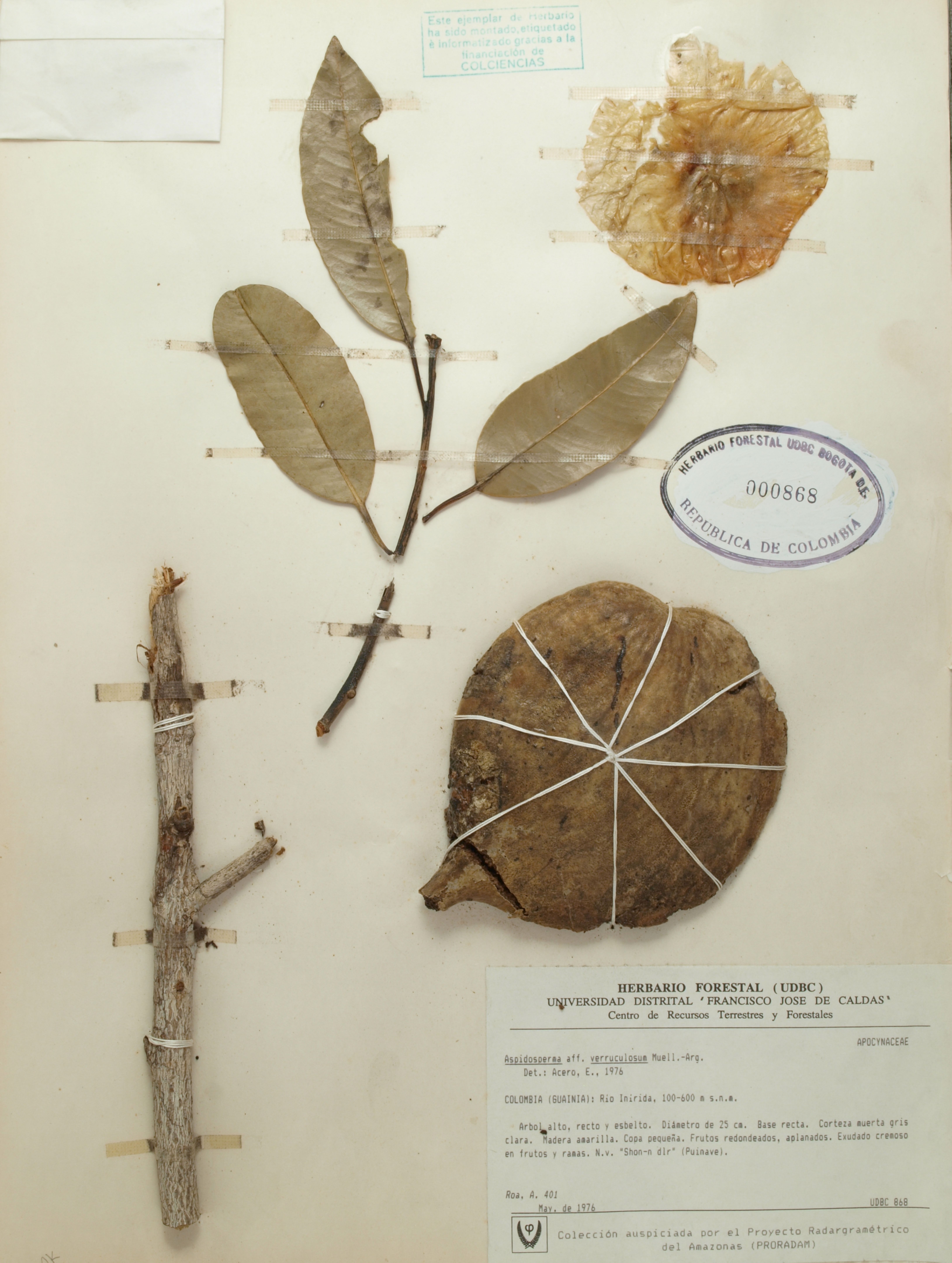 Fotografía del ejemplar Roa, A. 401, determinado como Aspidosperma verruculosum en el año 1976