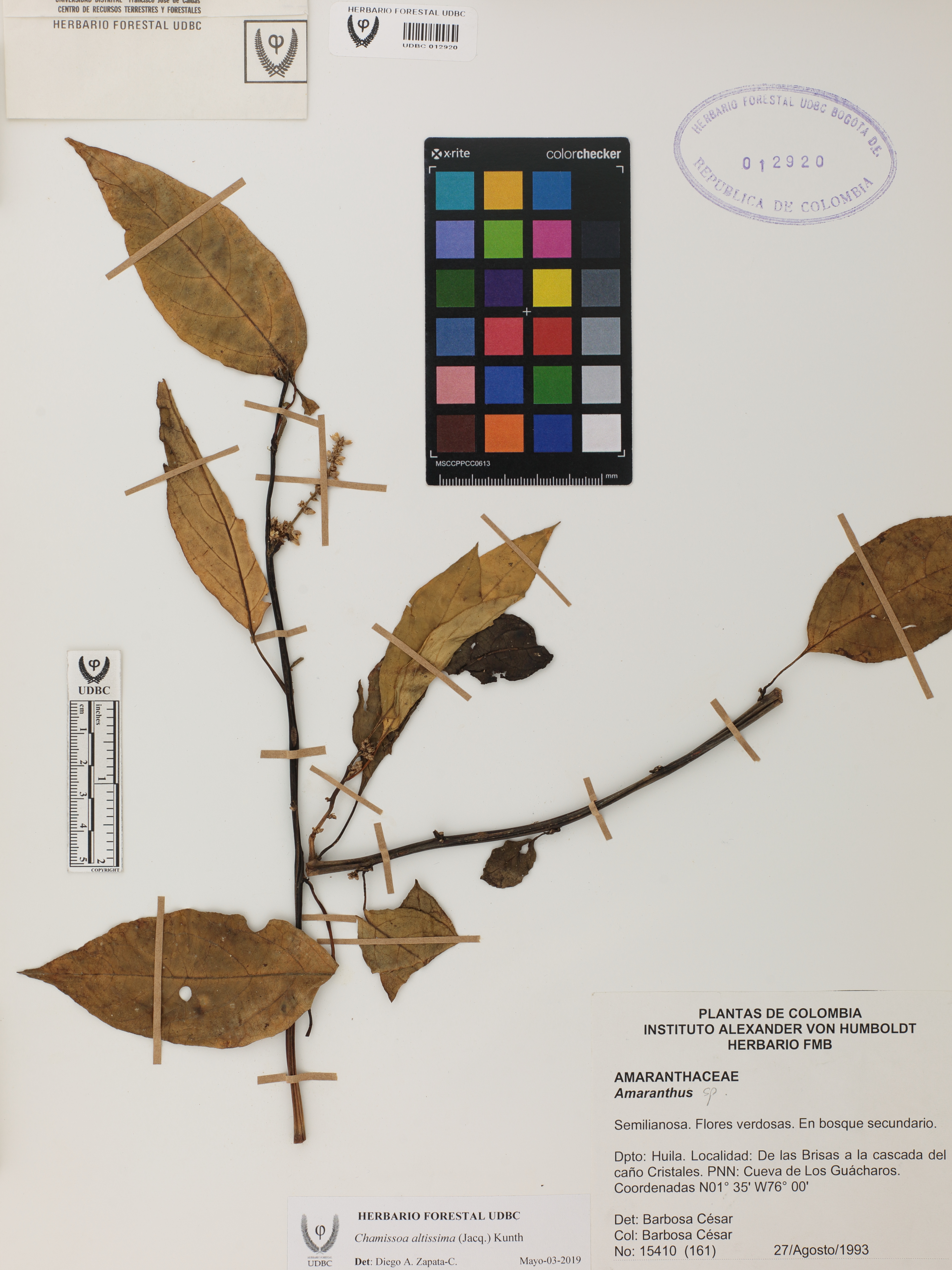 Fotografía del ejemplar Barbosa, C. 15410, determinado como Chamissoa altissima en el año 2019