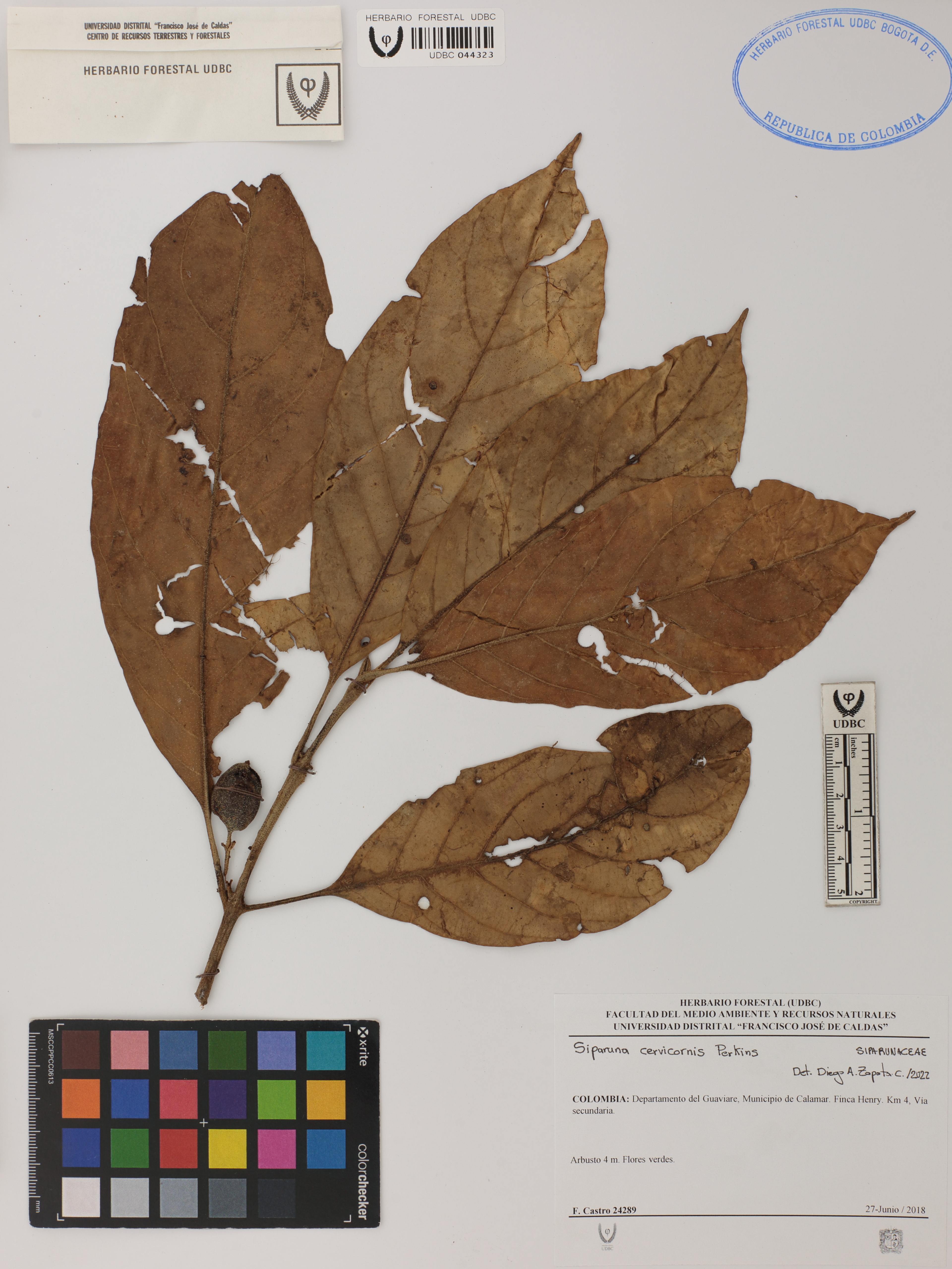 Fotografía del ejemplar Castro, F. 24289, determinado como Siparuna cervicornis en el año 2022