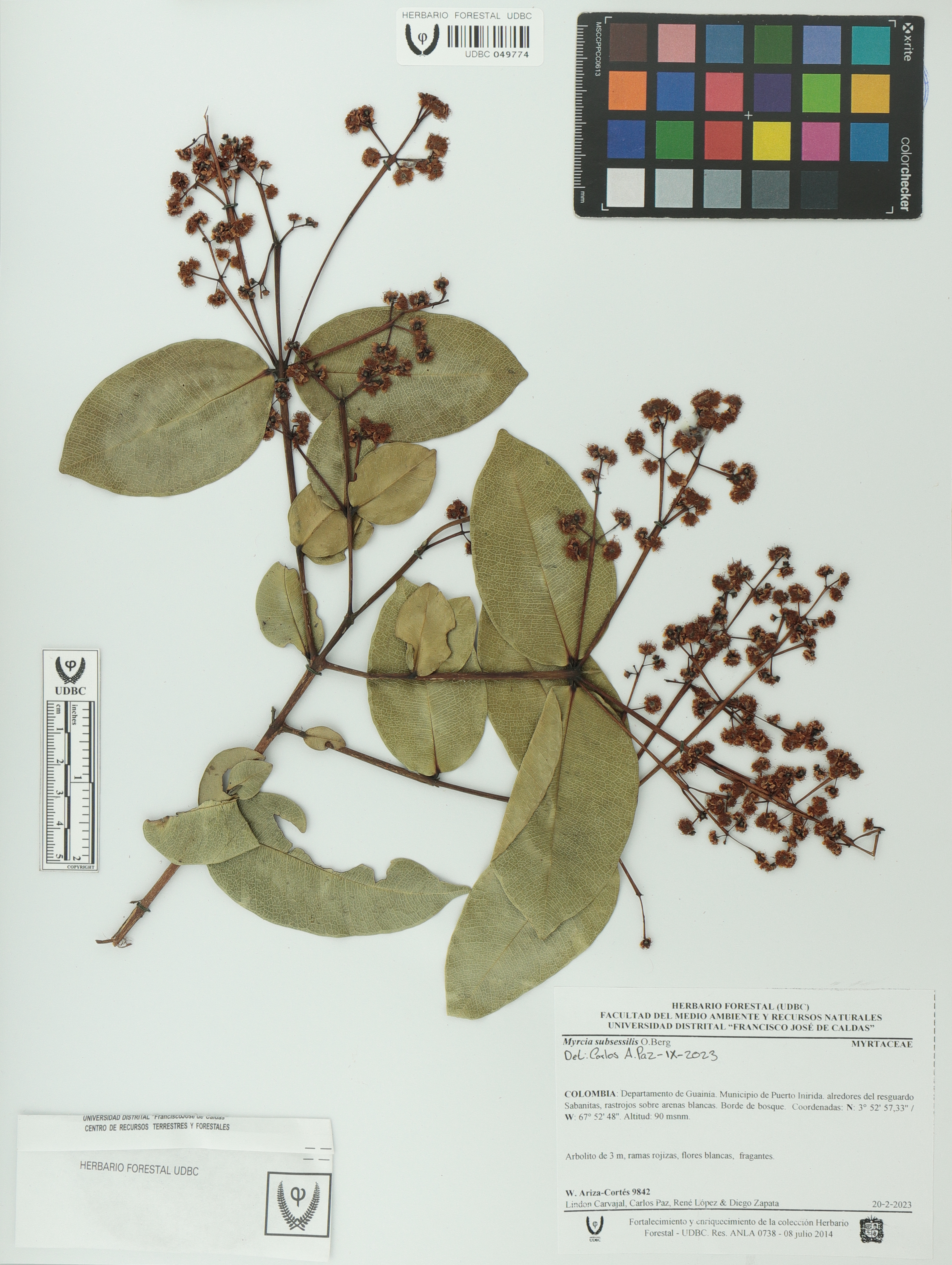 Fotografía del ejemplar Ariza-Cortés, W. 9842, determinado como Myrcia subsessilis en el año 2023