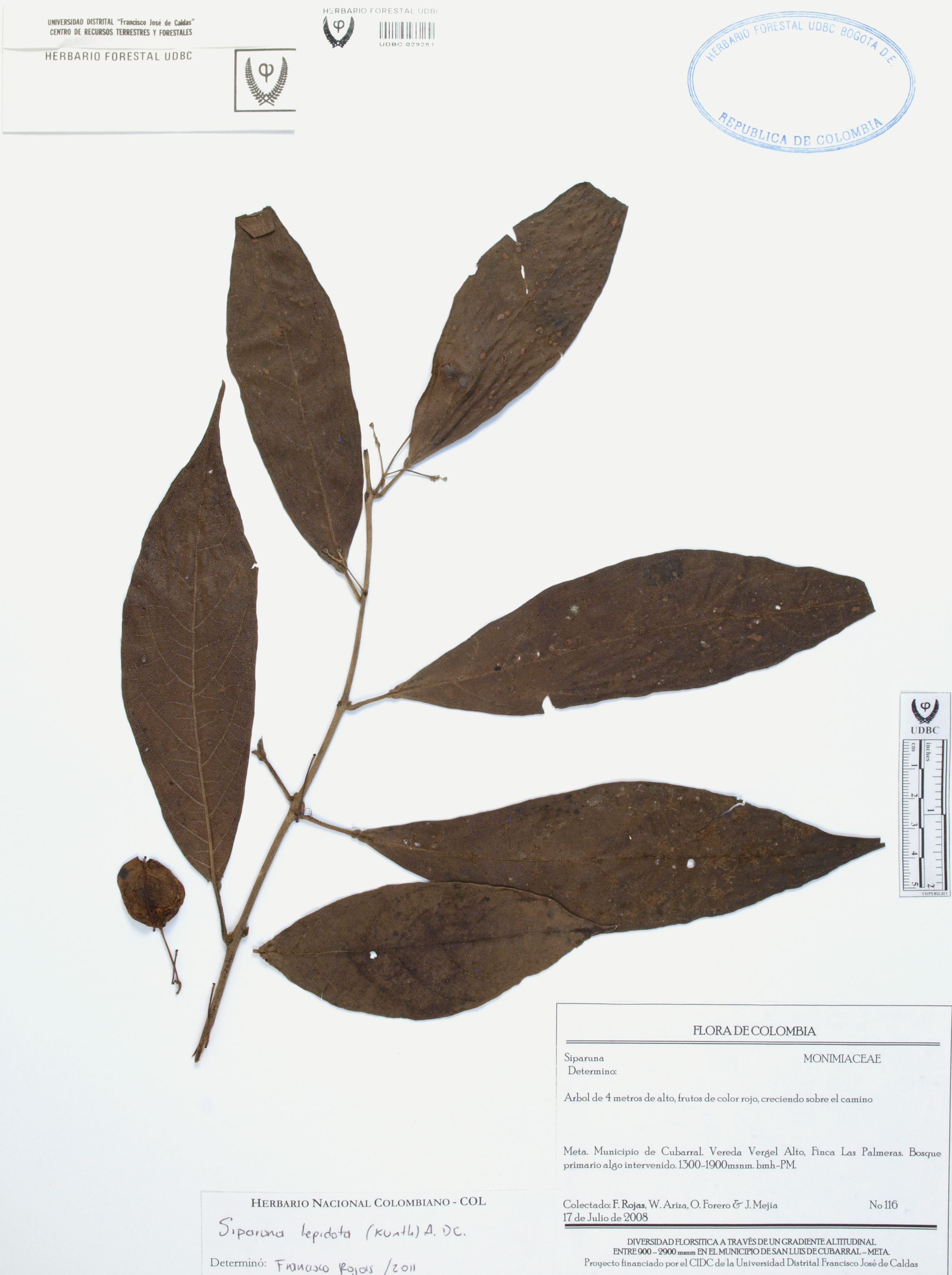 Fotografía del ejemplar Rojas, F. 116, determinado como Siparuna lepidota en el año 2011