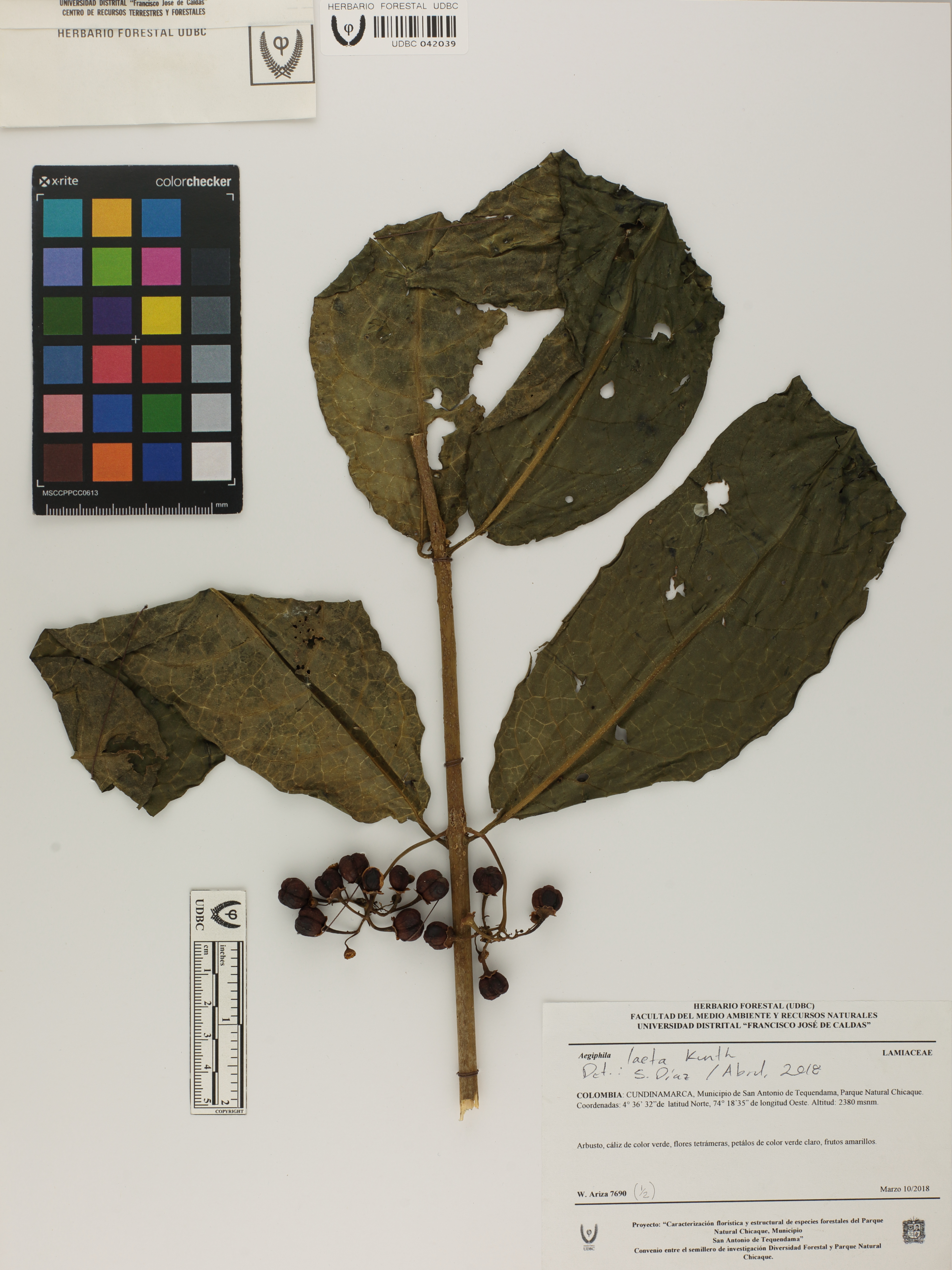 Fotografía del ejemplar Ariza, W. 7690, determinado como Aegiphila laeta en el año 2018
