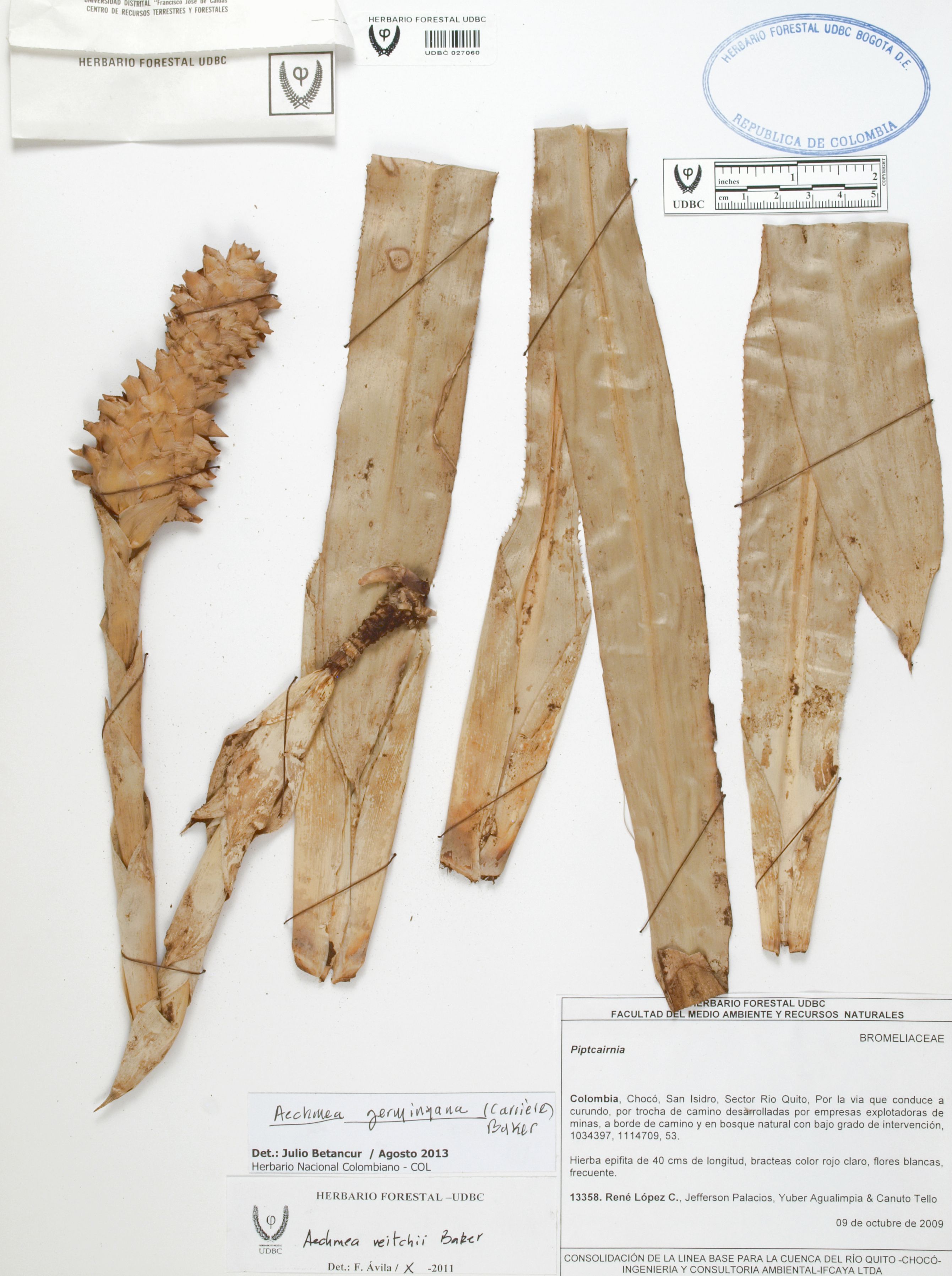 Fotografía del ejemplar López, R. 13358, determinado como Aechmea germinyana en el año 2013
