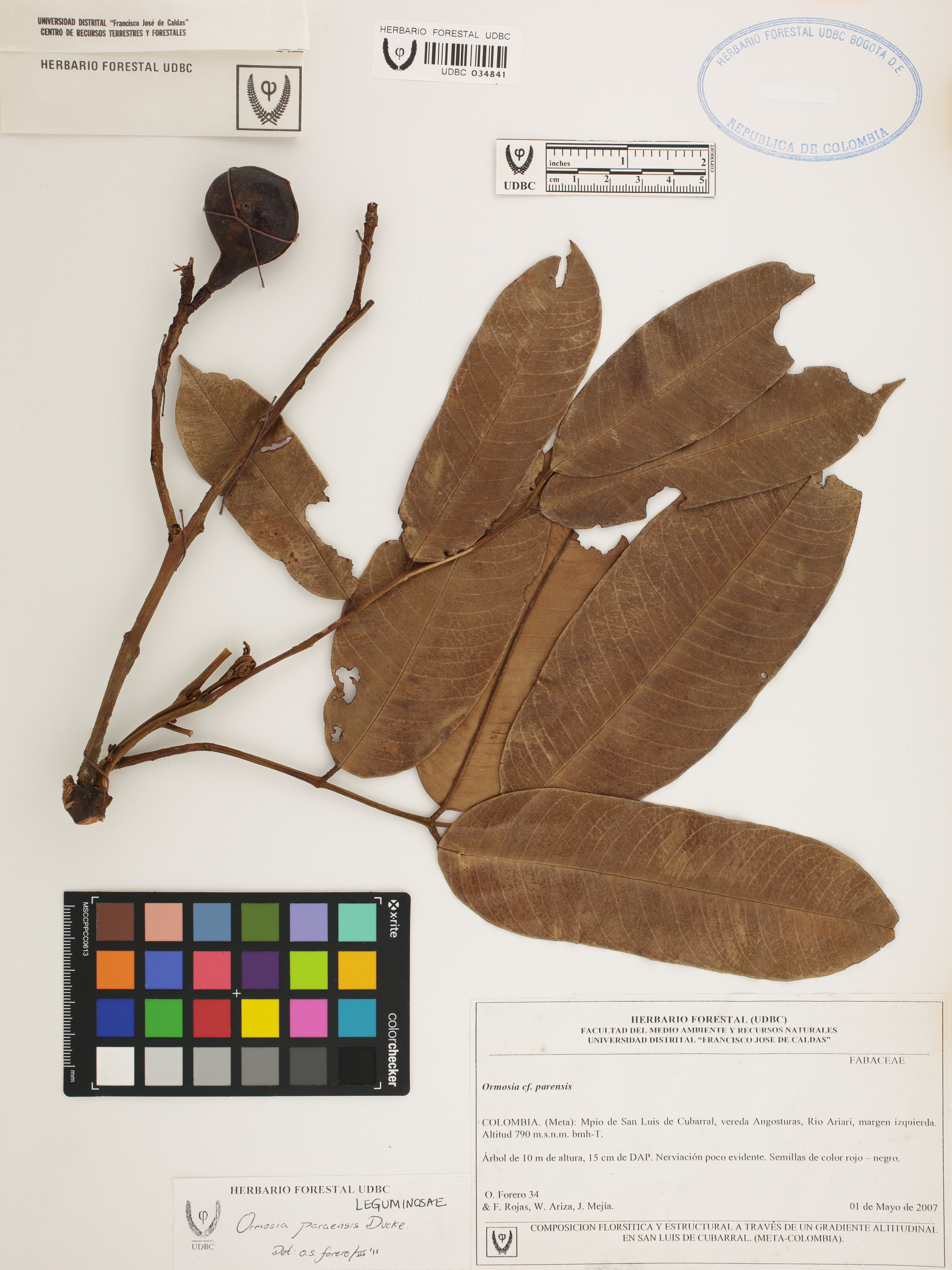 Fotografía del ejemplar Forero, O. 34, determinado como Ormosia paraensis en el año 2011