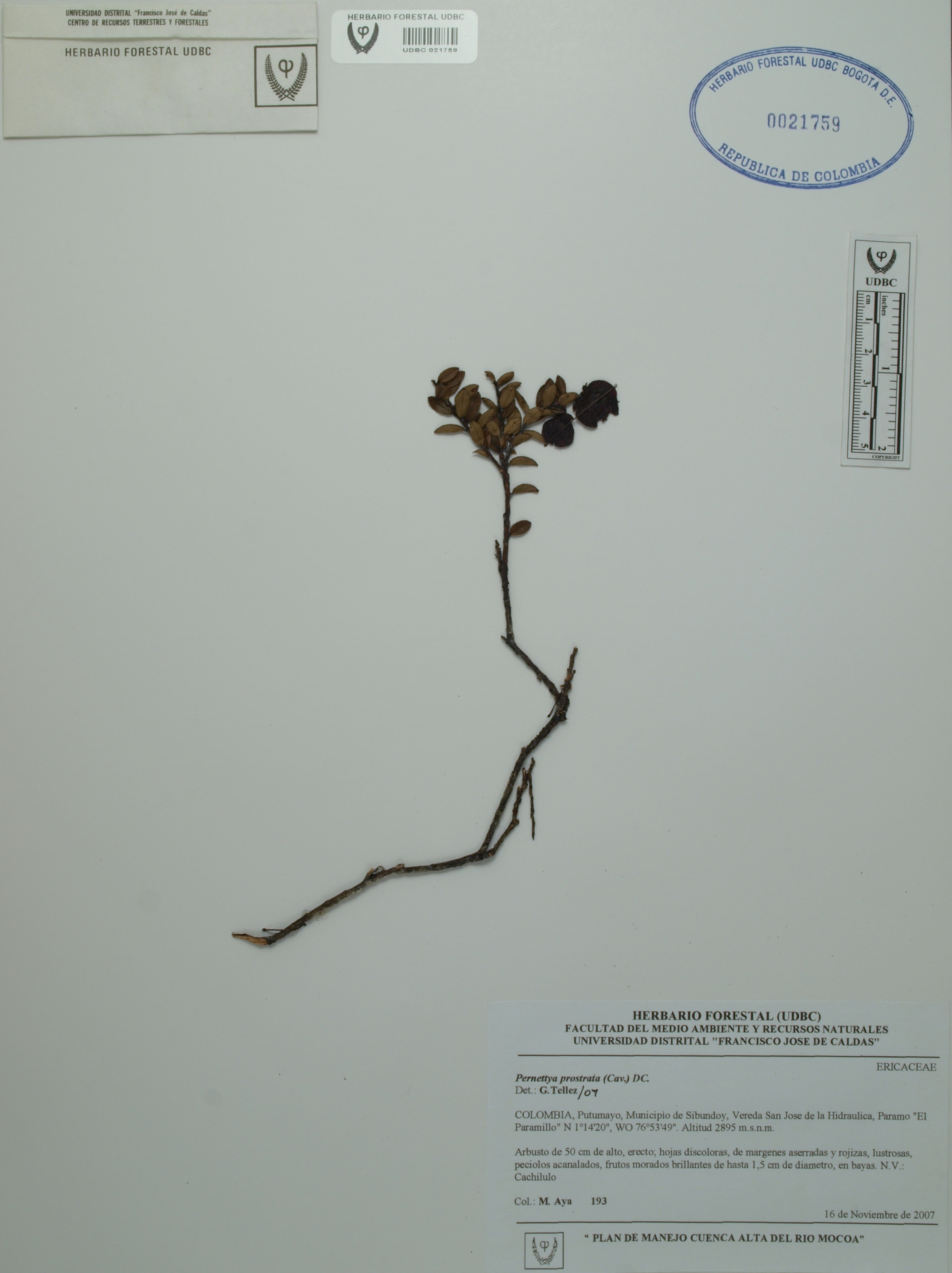 Fotografía del ejemplar Aya, M. 193, determinado como Pernettya prostrata en el año 2007