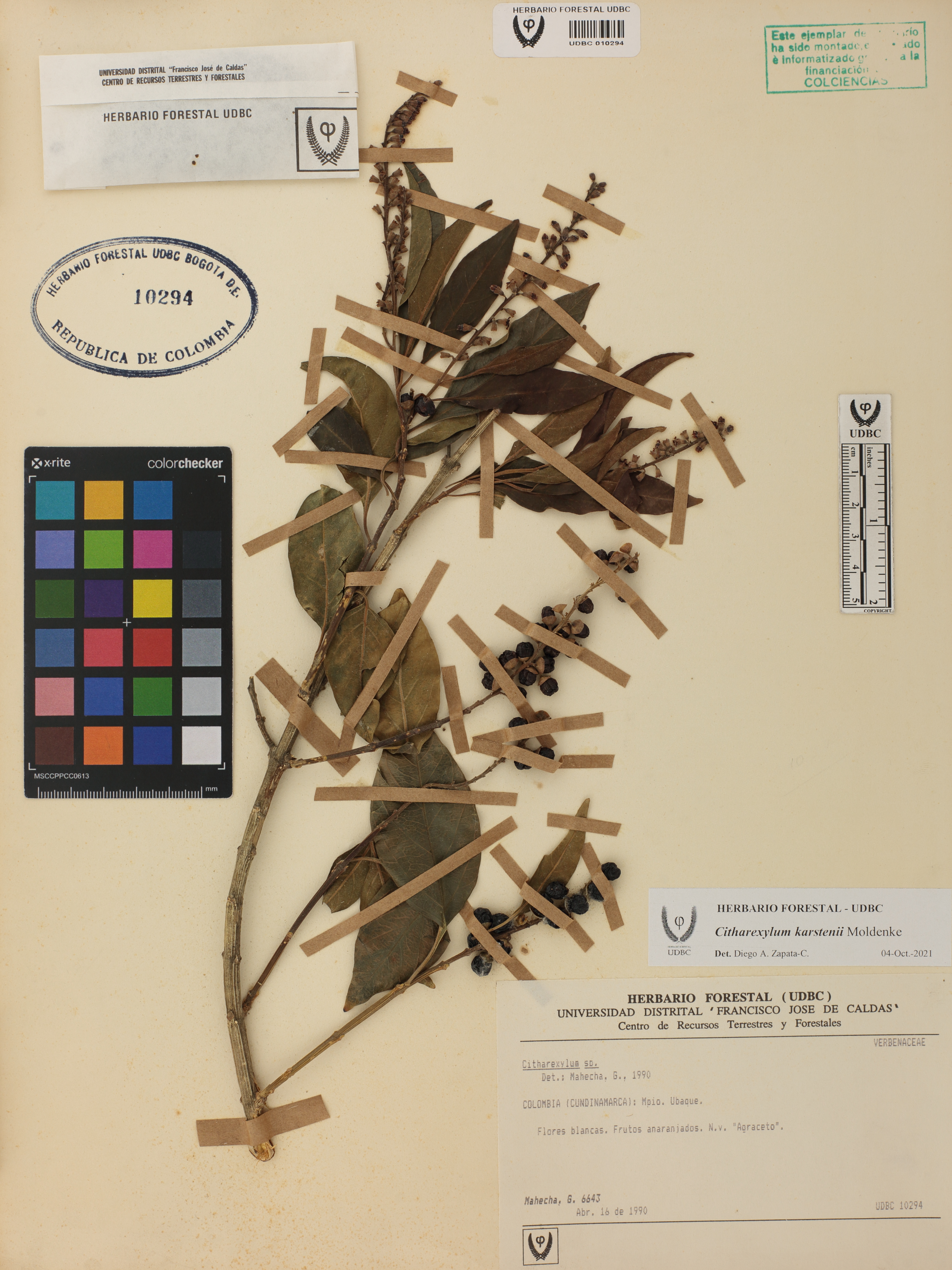Fotografía del ejemplar Mahecha, G. 6643, determinado como Citharexylum karstenii en el año 2021
