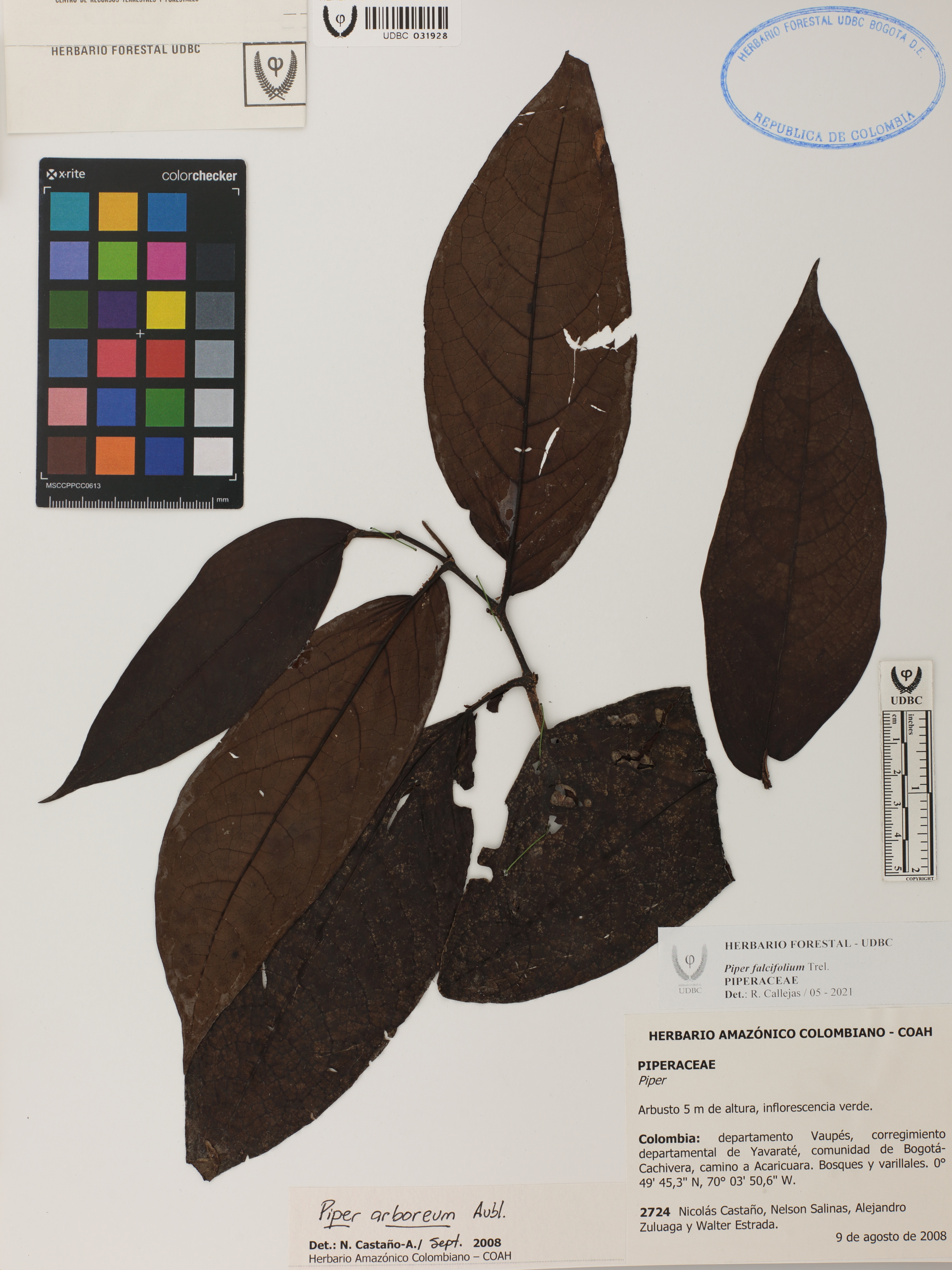 Fotografía del ejemplar Castaño, N. 2724, determinado como Piper falcifolium en el año 2021