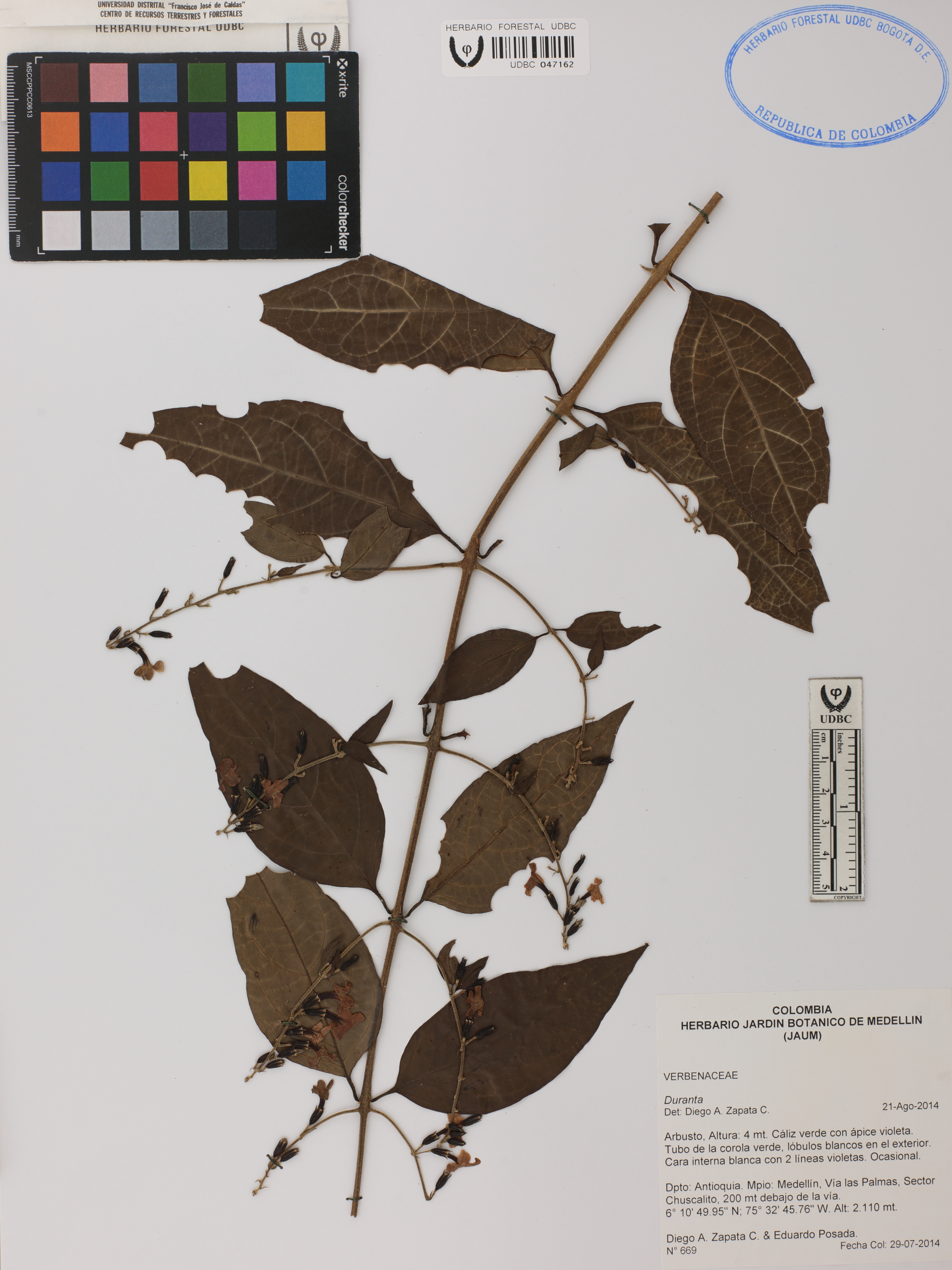 Fotografía del ejemplar Zapata-C., D. 669, determinado como Duranta sp. en el año 2014