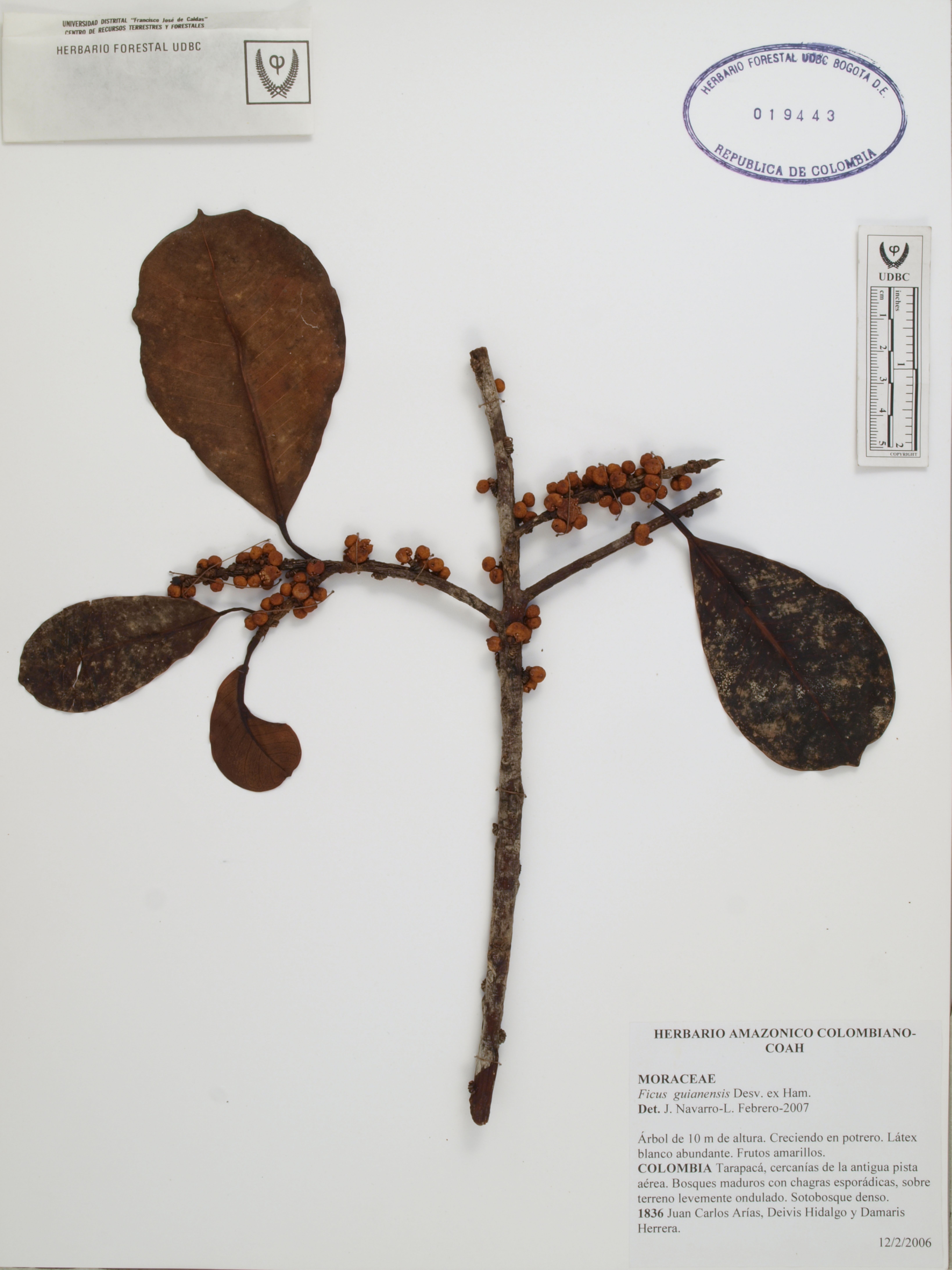 Fotografía del ejemplar Arias, J. 1836, determinado como Ficus americana subsp. guianensis en el año 2007