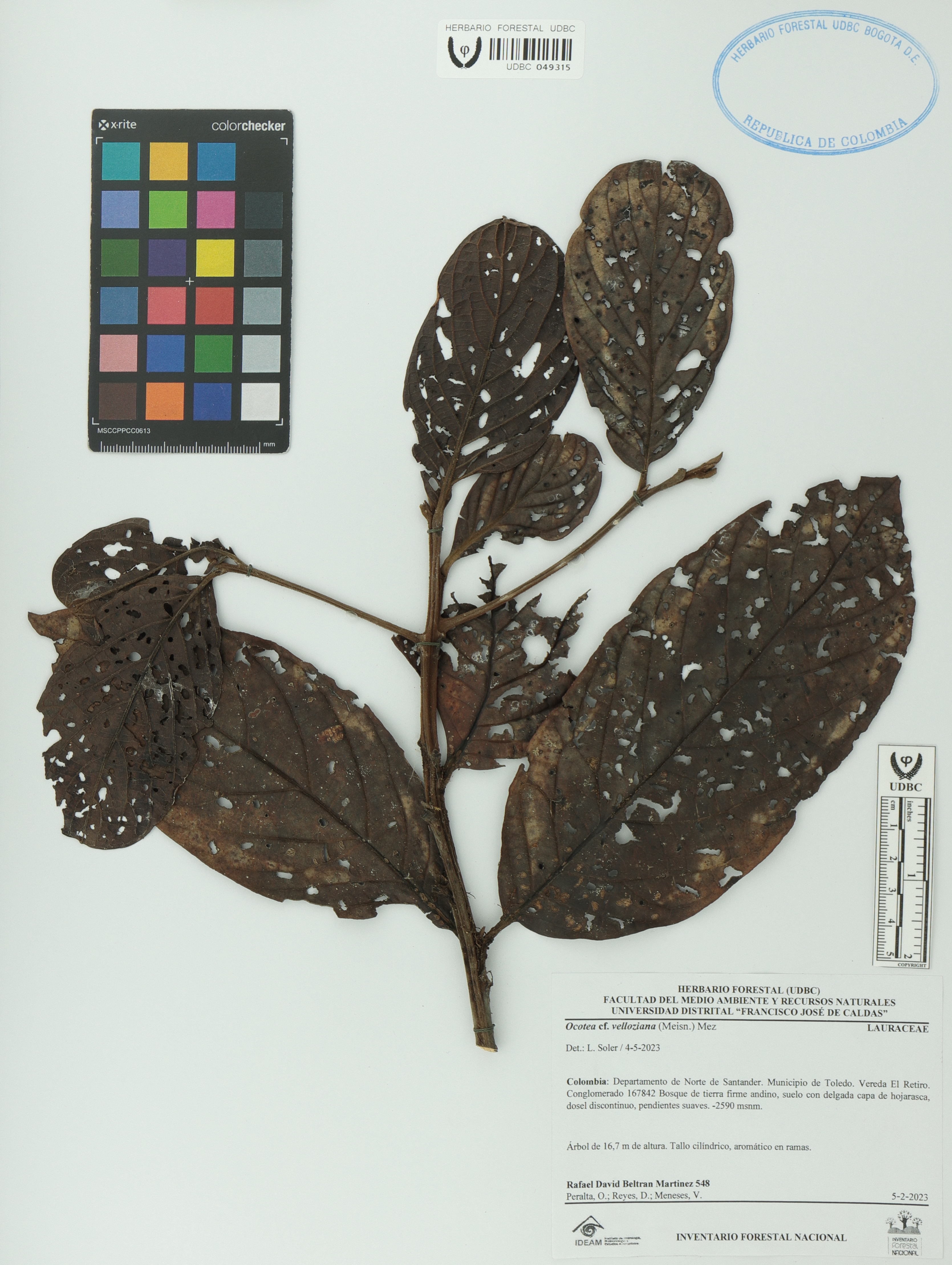 Fotografía del ejemplar Beltrán-M., R. 548, determinado como Ocotea velloziana en el año 2023