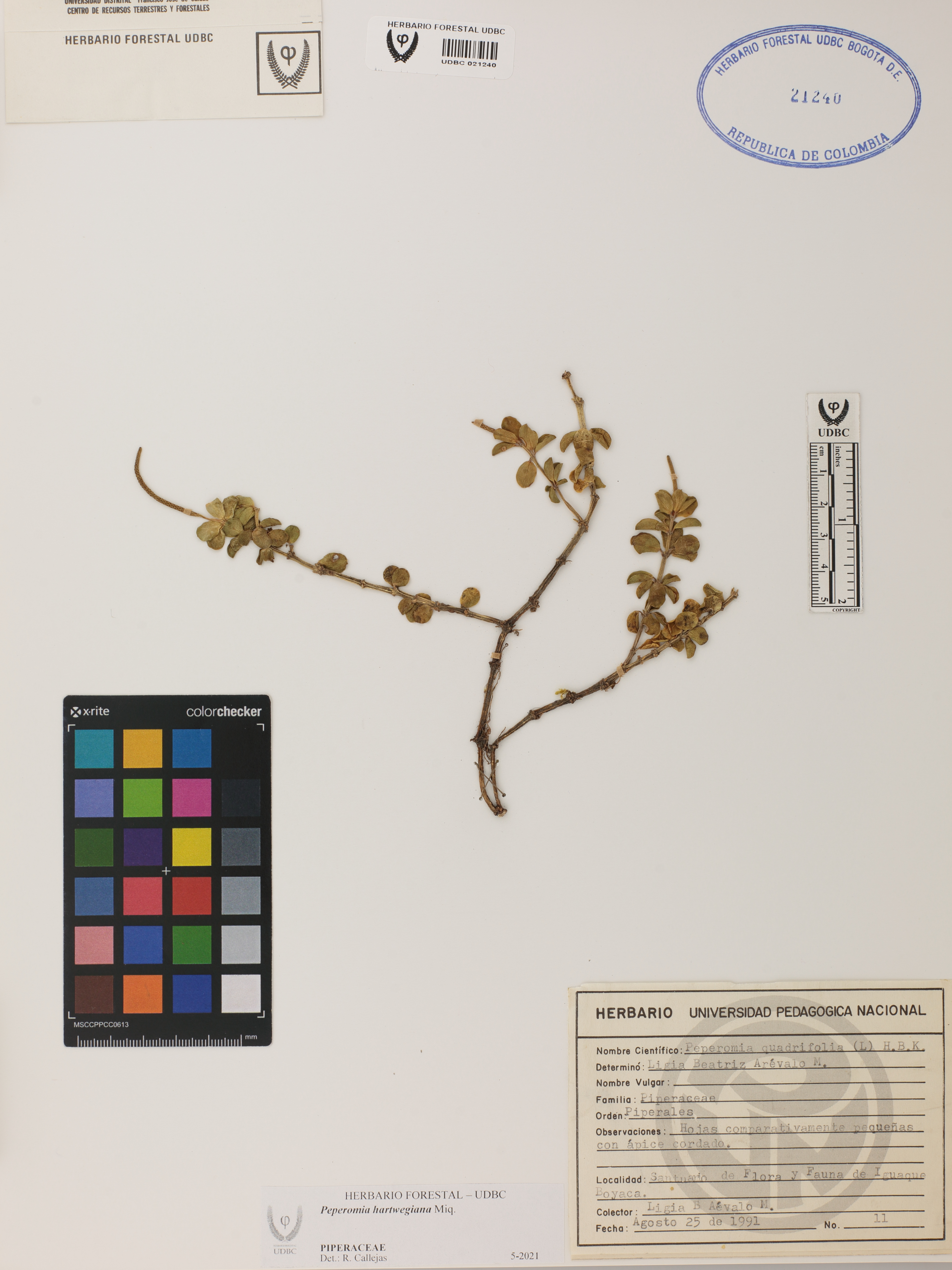 Fotografía del ejemplar Arévalo, L. 11, determinado como Peperomia hartwegiana en el año 2021