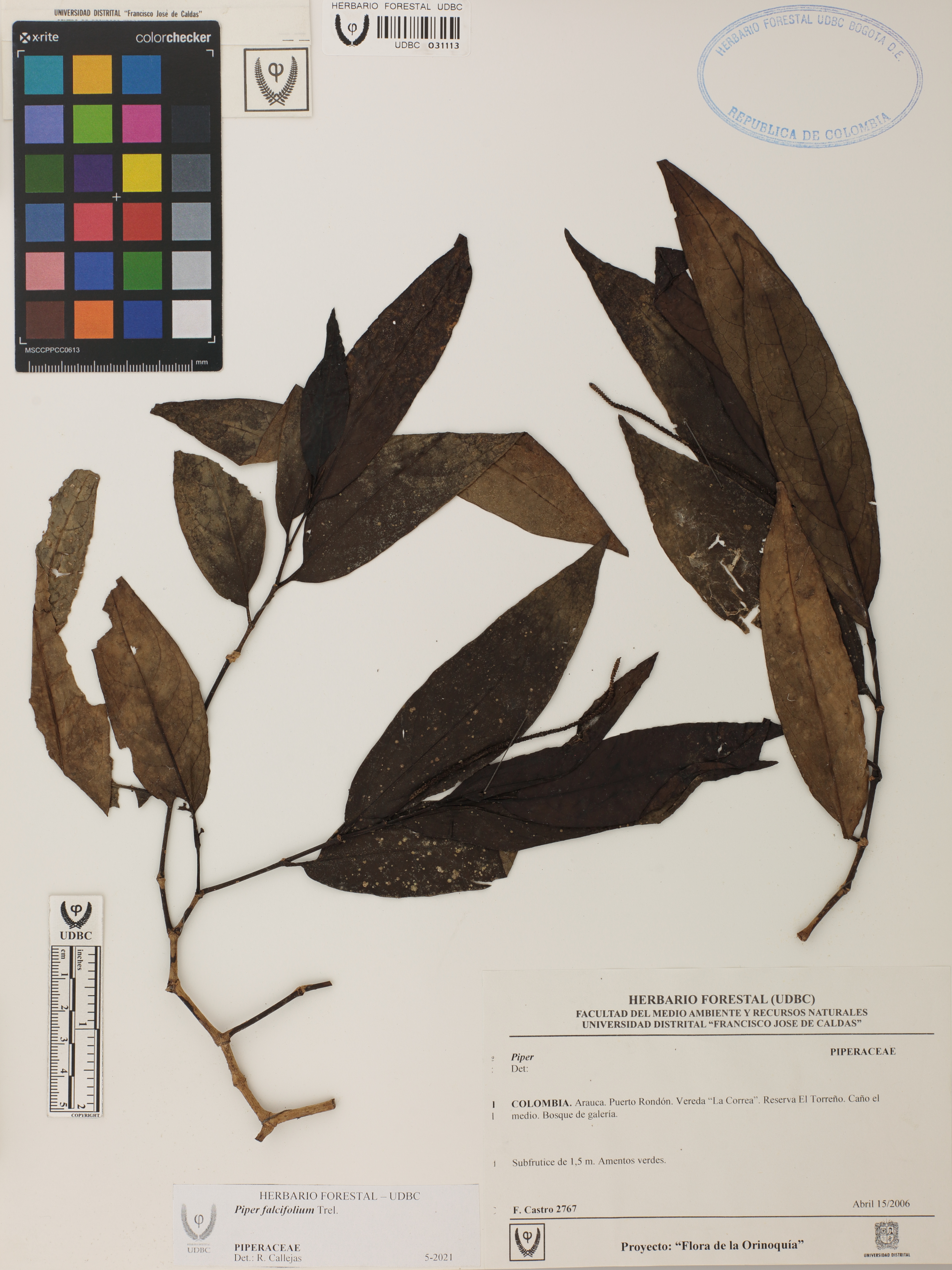 Fotografía del ejemplar Castro, F. 2767, determinado como Piper falcifolium en el año 2021