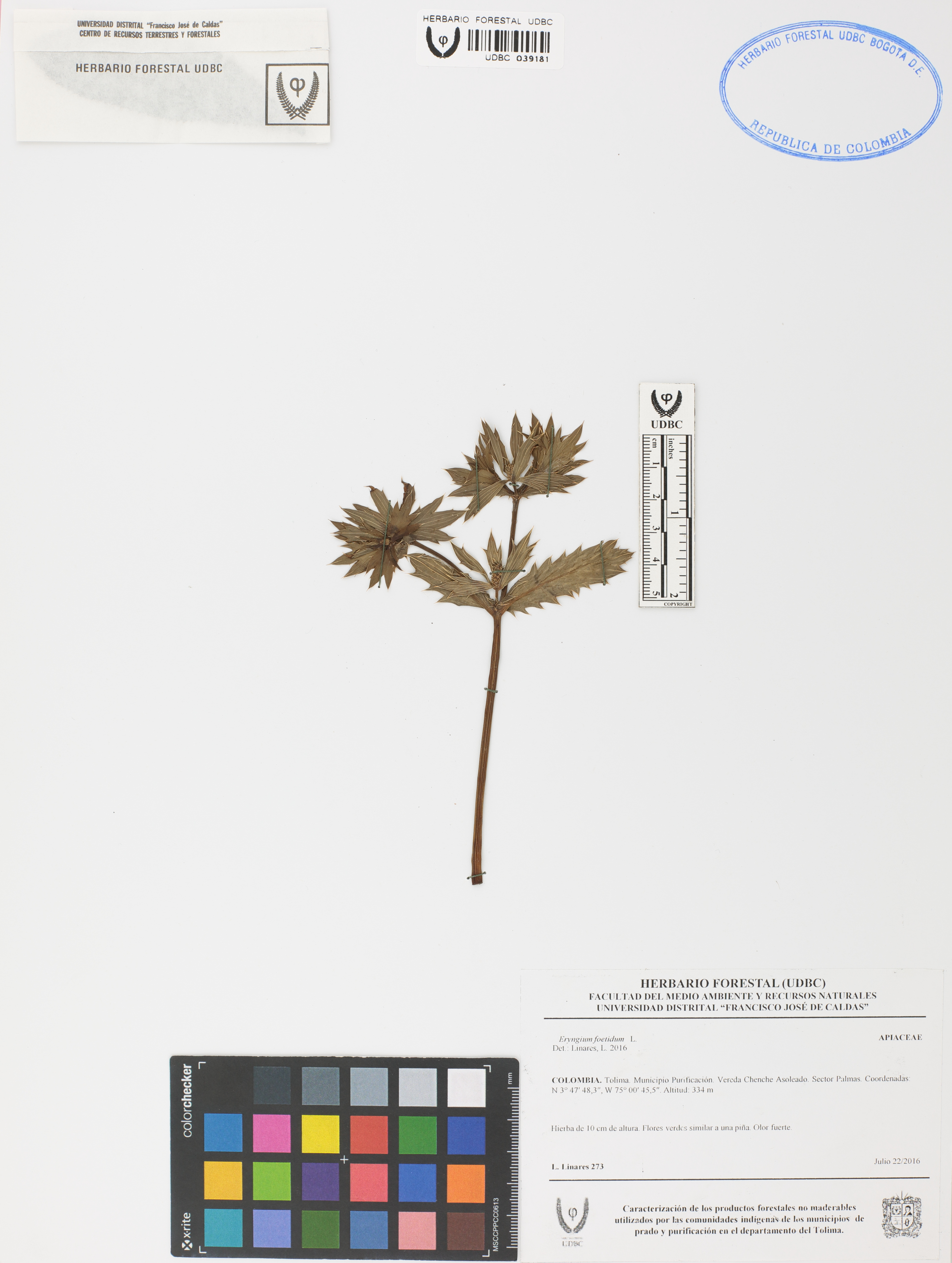 Fotografía del ejemplar Linares, L. 273, determinado como Eryngium foetidum en el año 2016