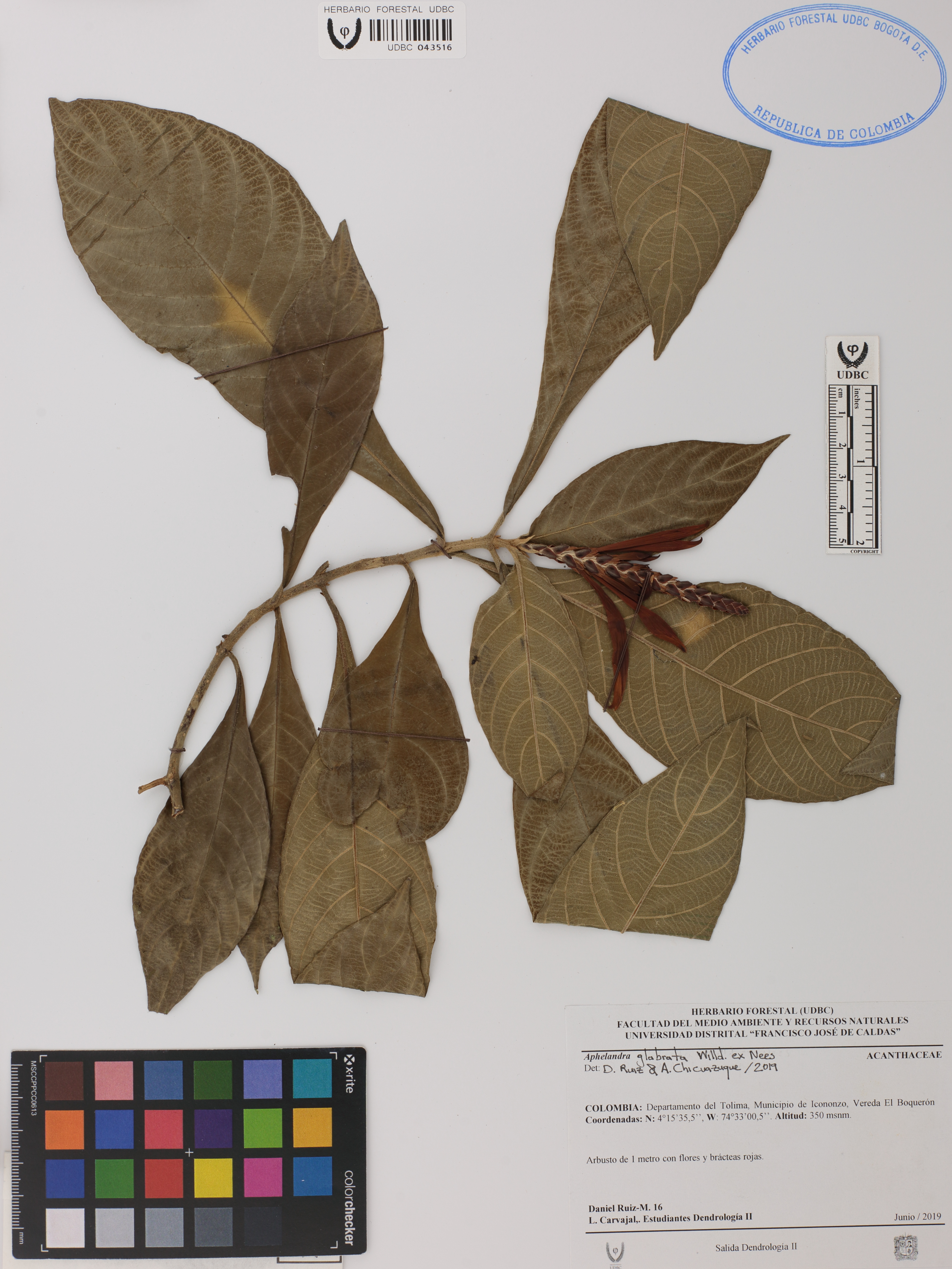 Fotografía del ejemplar Ruiz-M., D. 16, determinado como Aphelandra glabrata en el año 2019