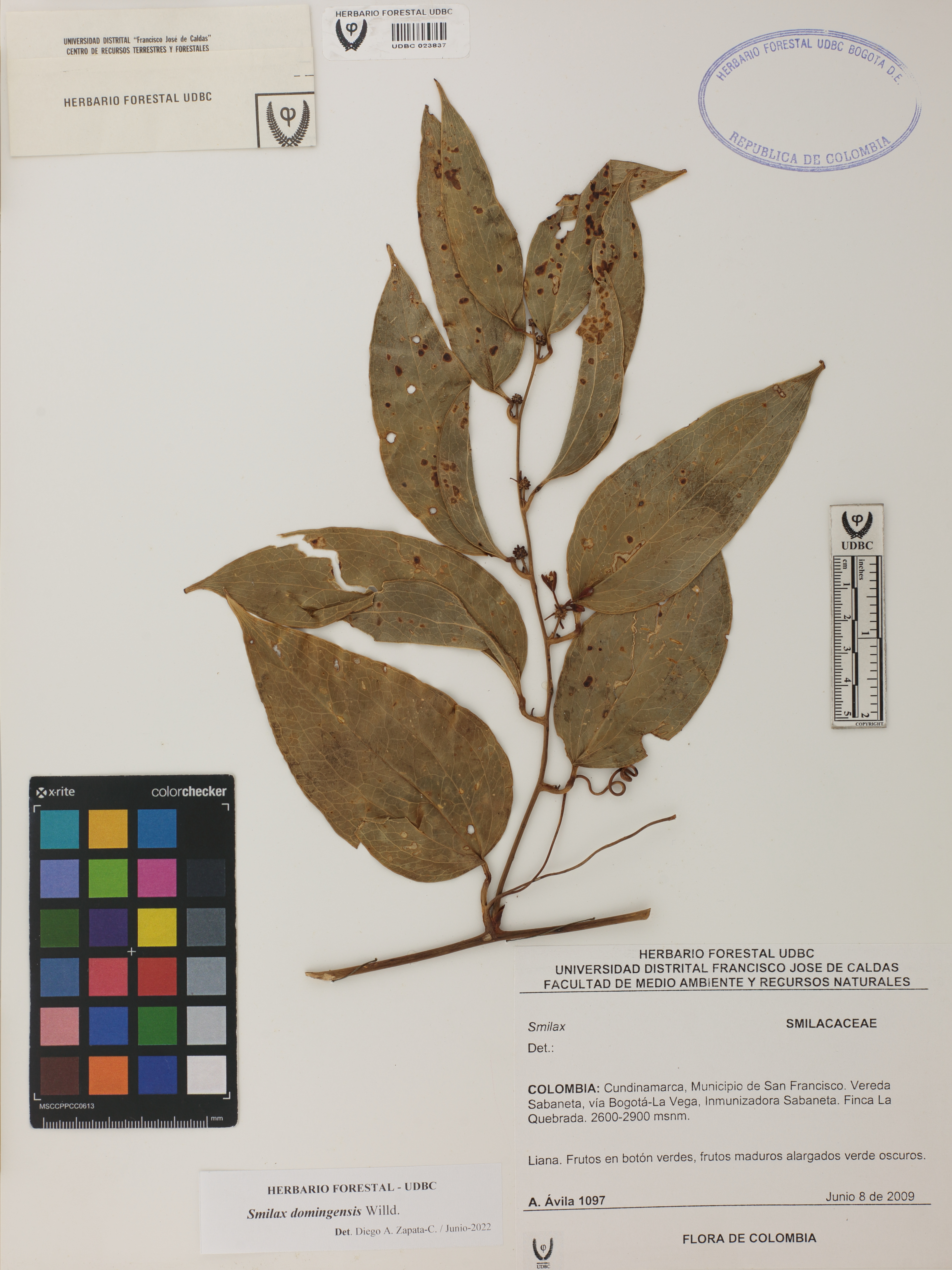Fotografía del ejemplar Ávila, A. 1097, determinado como Smilax domingensis en el año 2022
