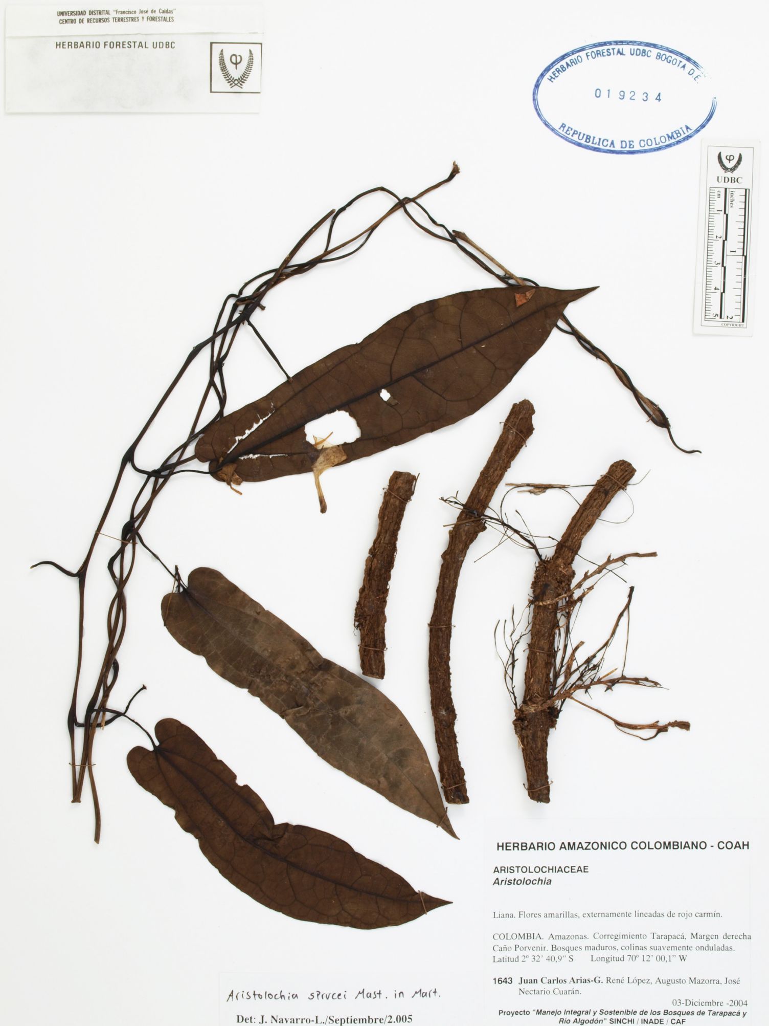 Fotografía del ejemplar Arias, J. 1643, determinado como Aristolochia sprucei en el año 2005
