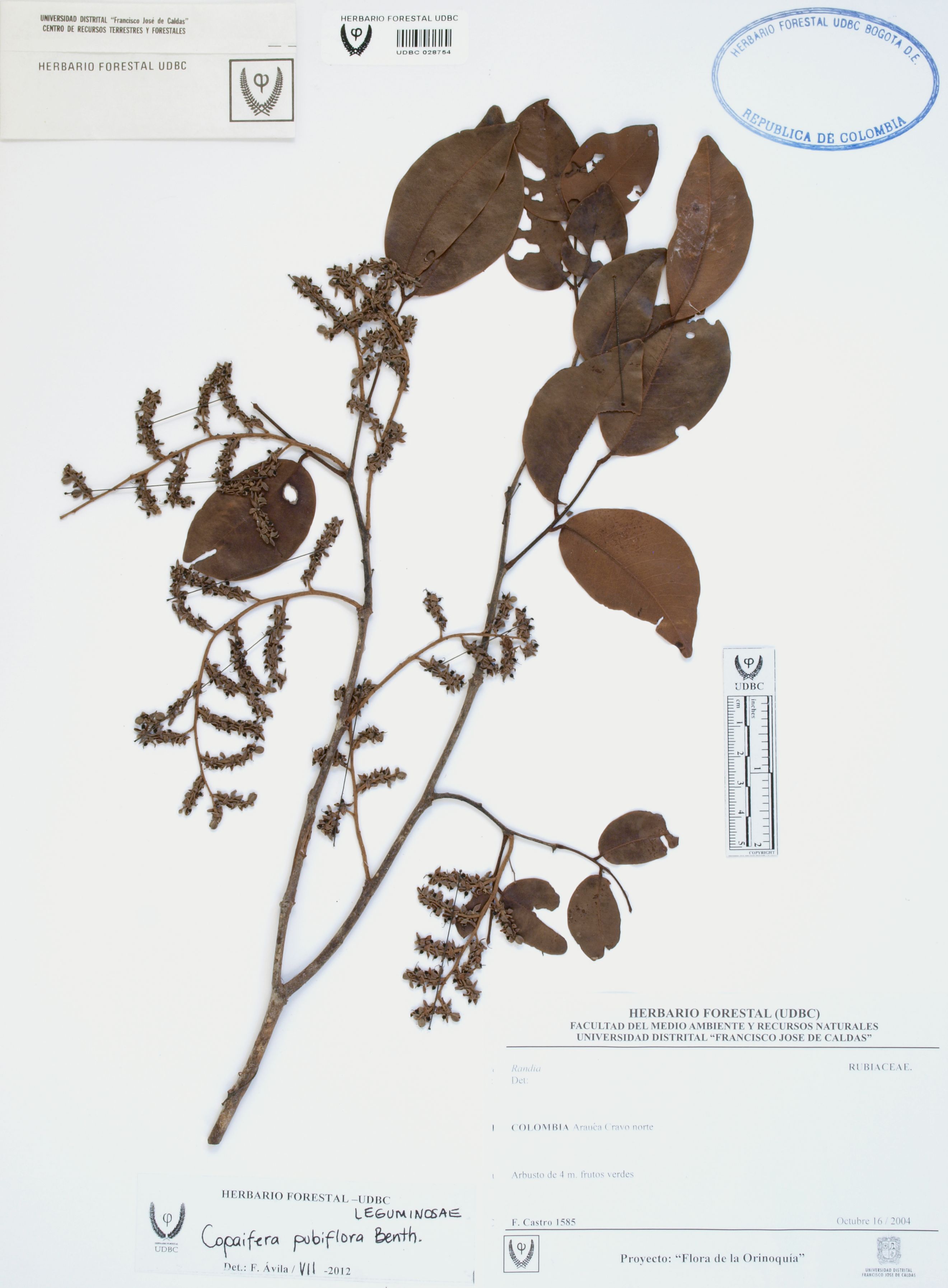 Fotografía del ejemplar Castro, F. 1585, determinado como Copaifera pubiflora en el año 2012