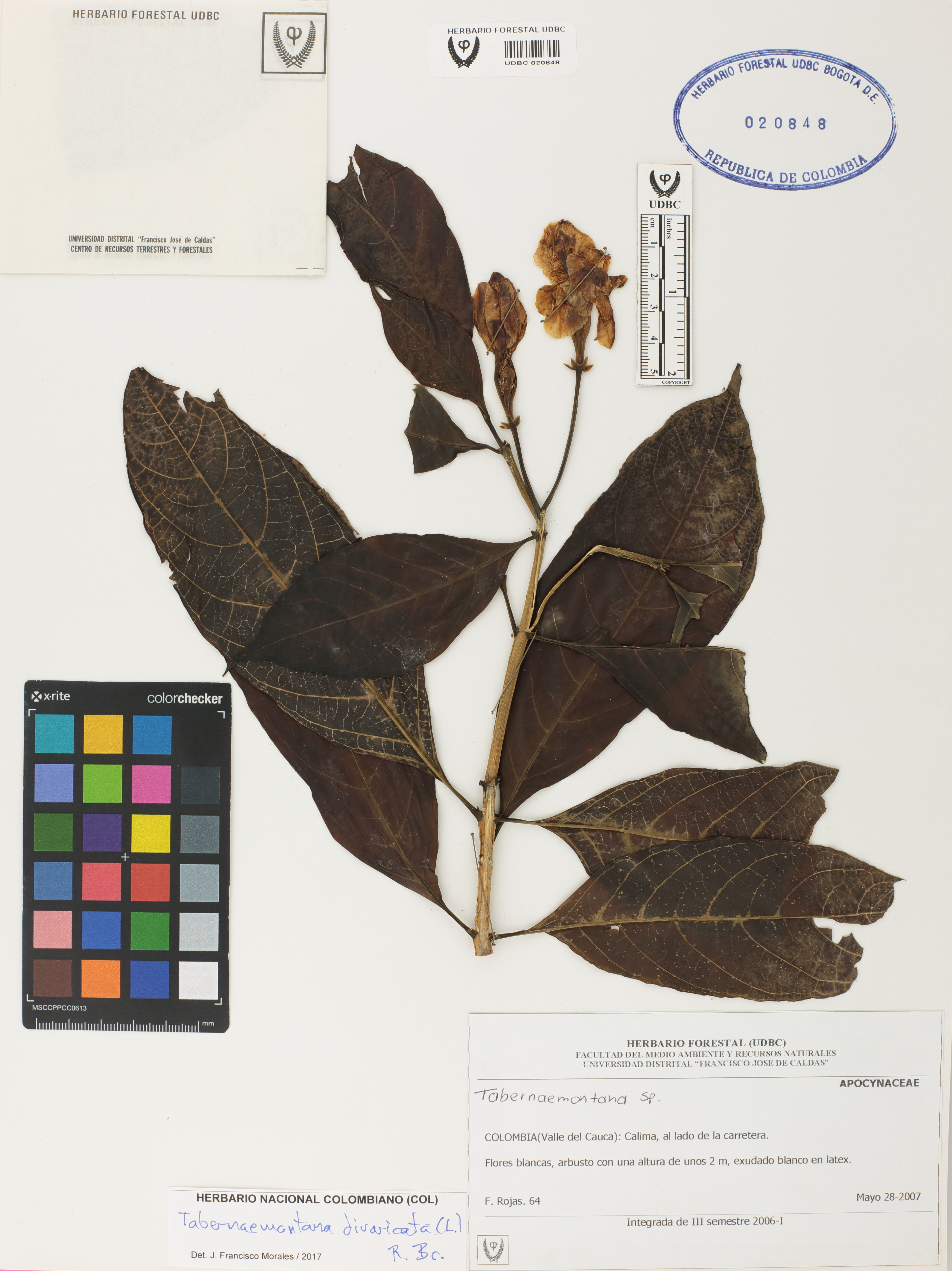 Fotografía del ejemplar Rojas, F. 64, determinado como Tabernaemontana divaricata en el año 2017