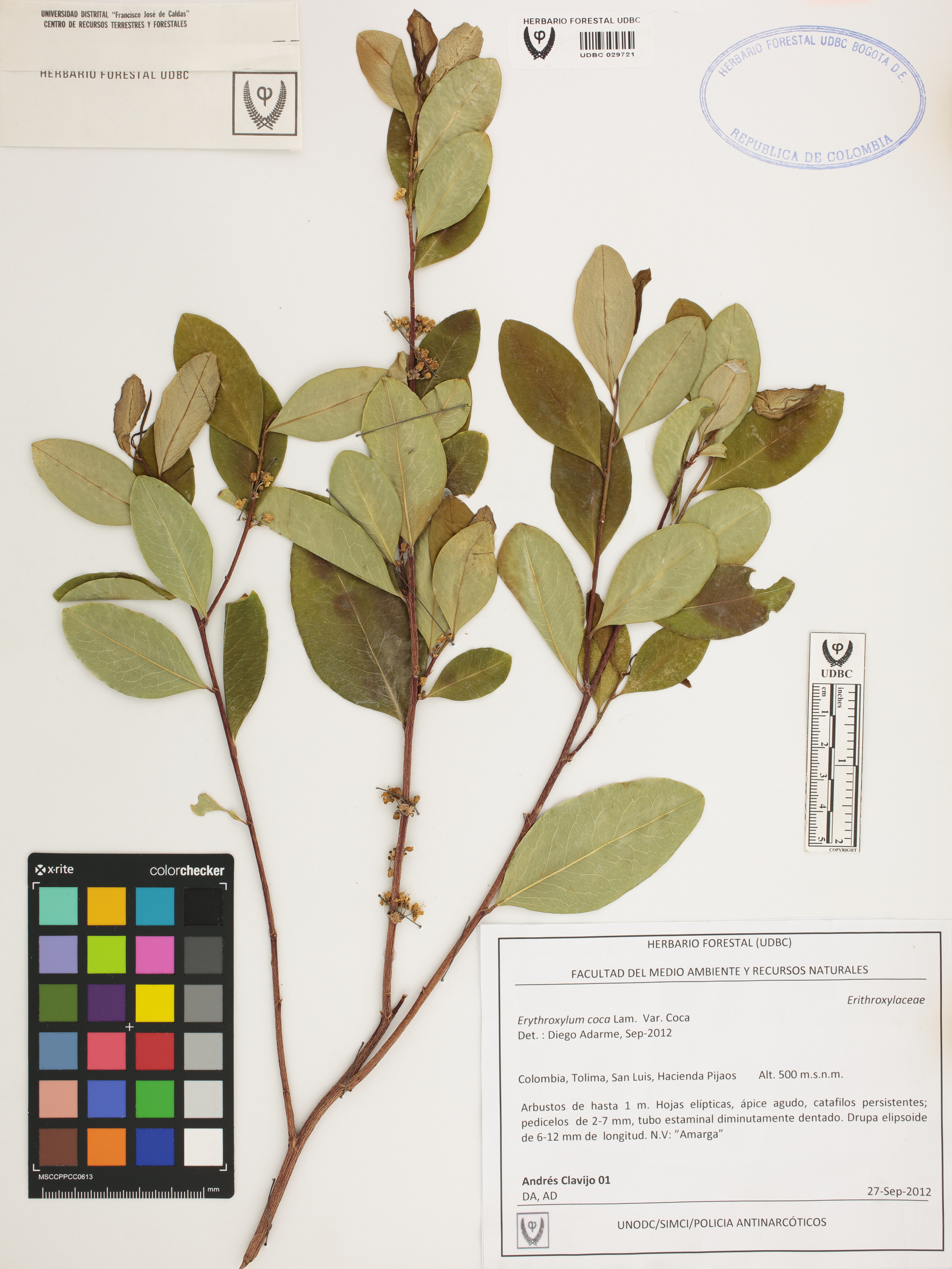 Fotografía del ejemplar Clavijo, J. 1, determinado como Erythroxylum coca var. coca en el año 2012