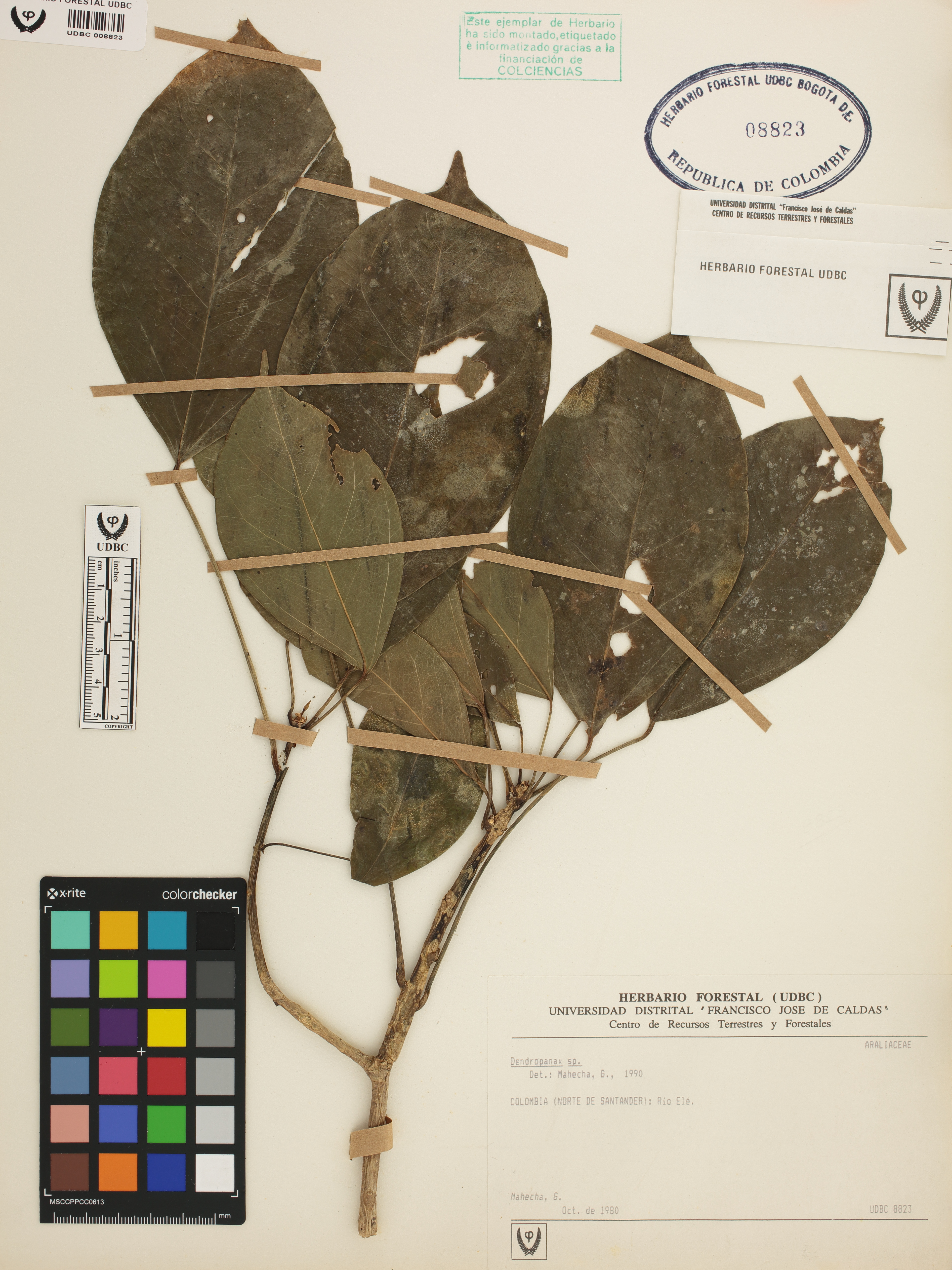 Fotografía del ejemplar Mahecha, G., determinado como Dendropanax sp. en el año 1990