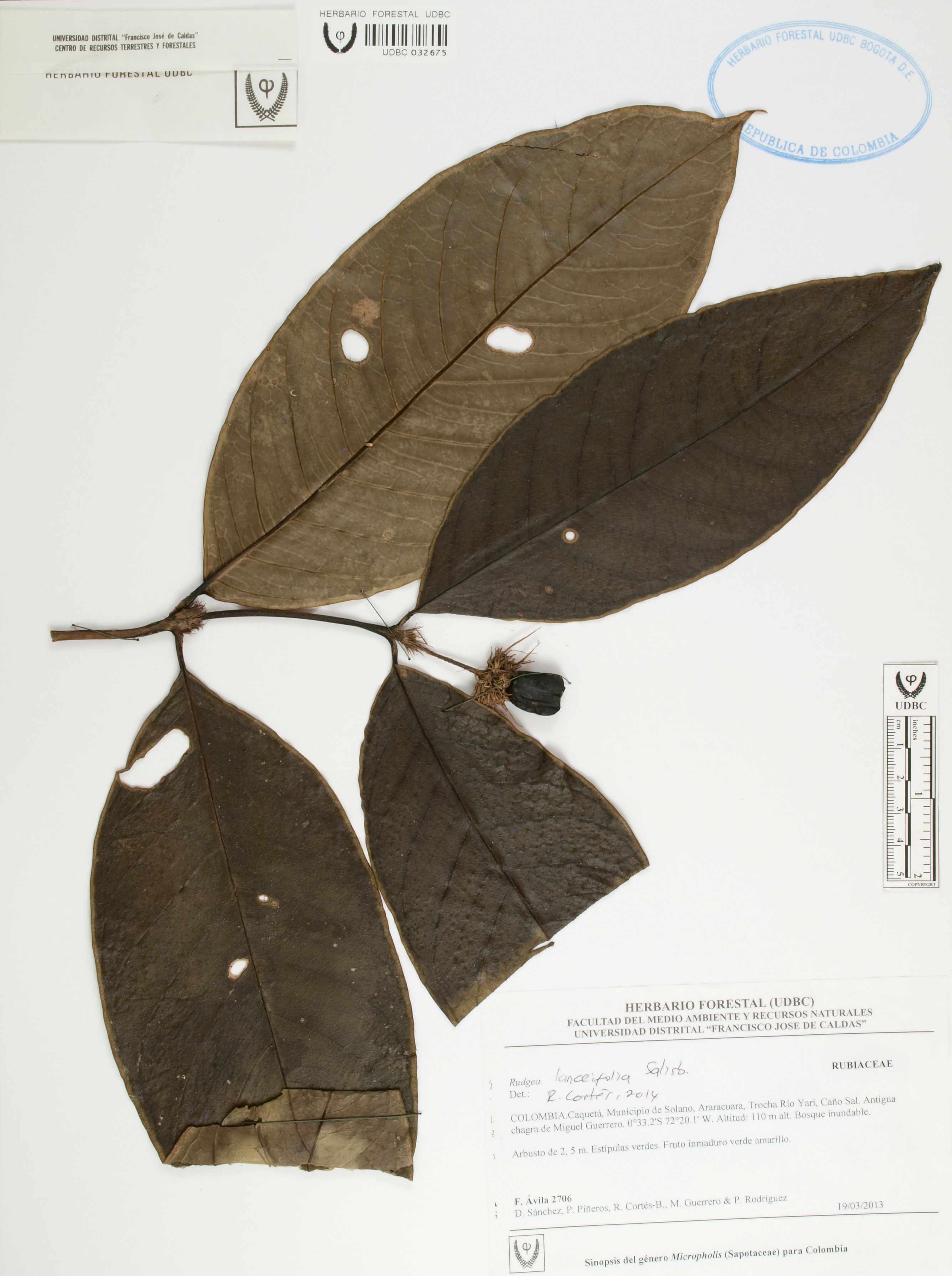 Fotografía del ejemplar Ávila, F. 2716, determinado como Rudgea lanceifolia en el año 2014