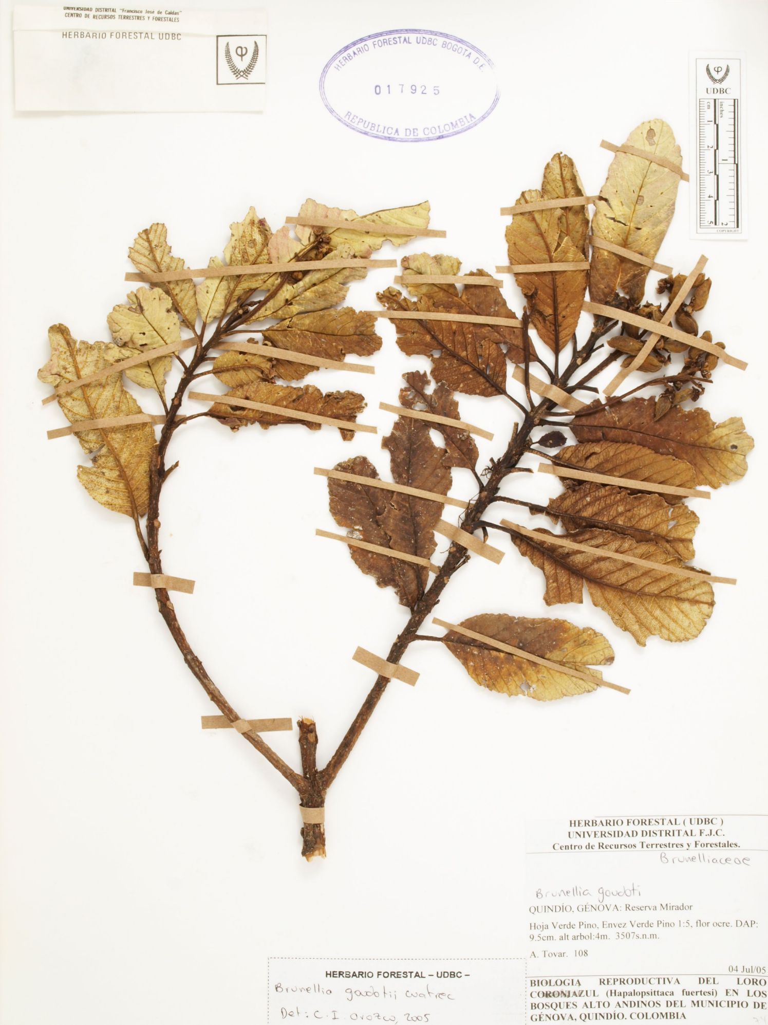 Fotografía del ejemplar Tovar, A. 108, determinado como Brunellia goudotii en el año 2005