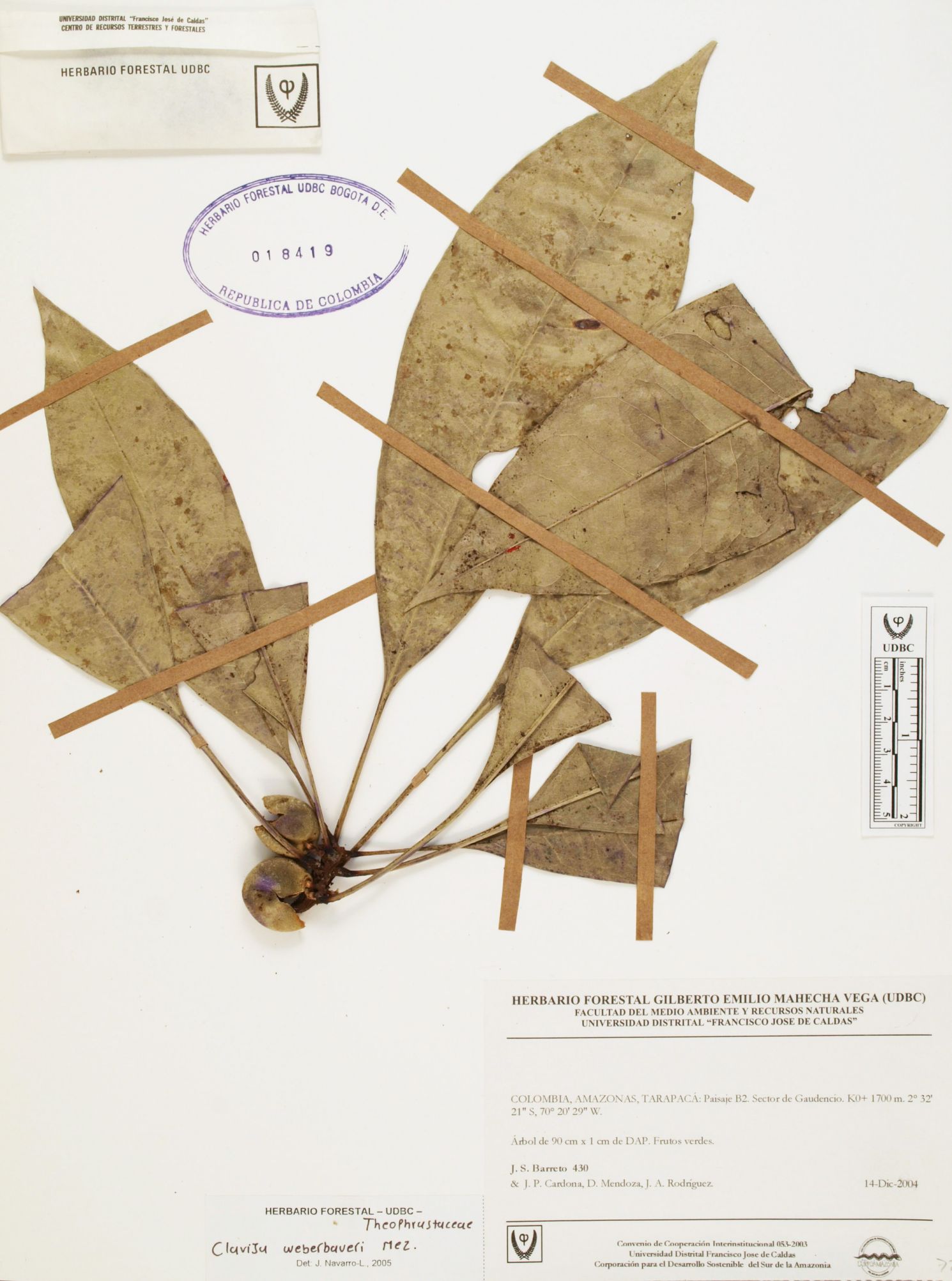 Fotografía del ejemplar Barreto, J. 430, determinado como Clavija weberbaueri en el año 2005