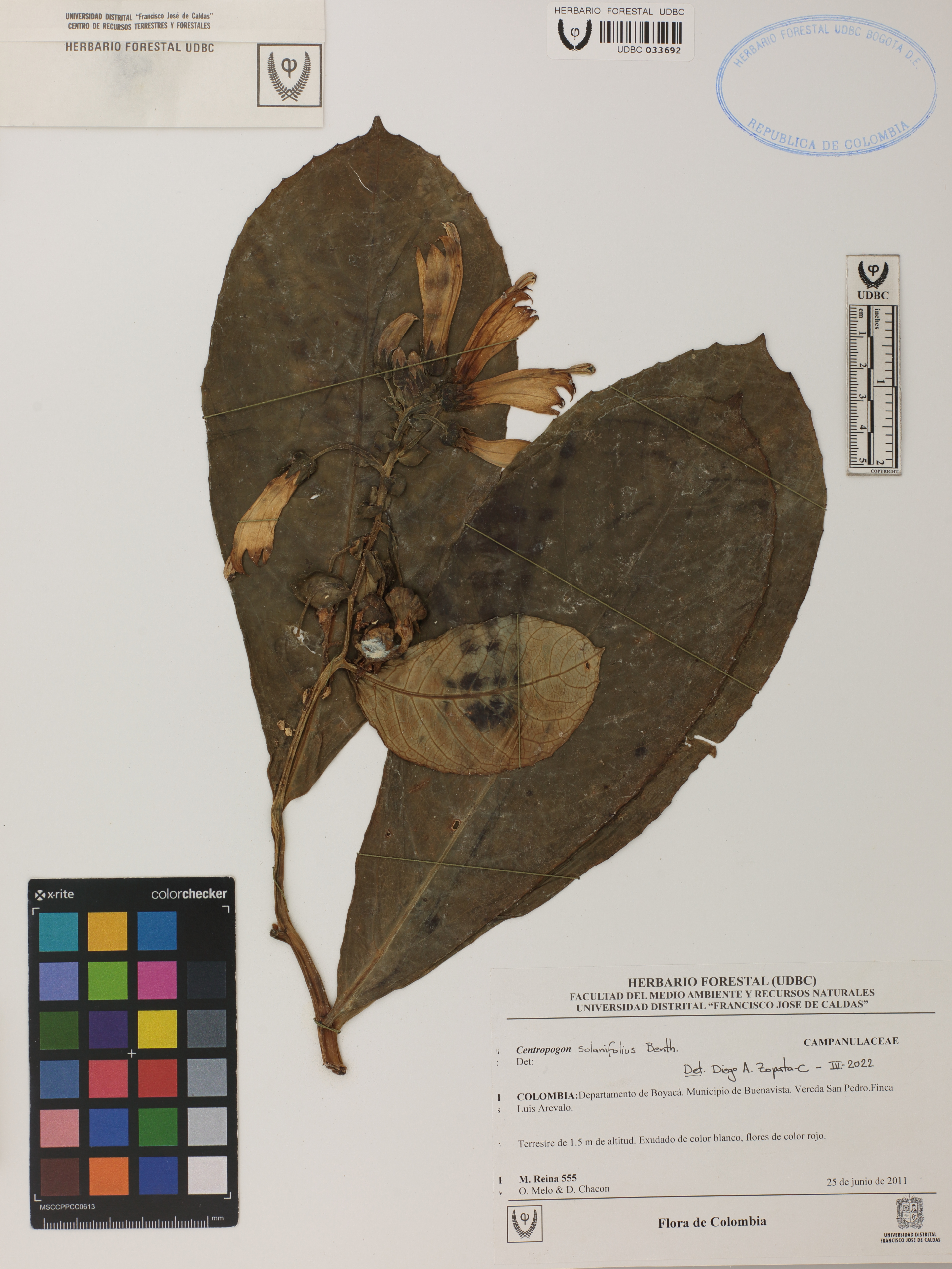Fotografía del ejemplar Reina, M. 555, determinado como Centropogon solanifolius en el año 2022