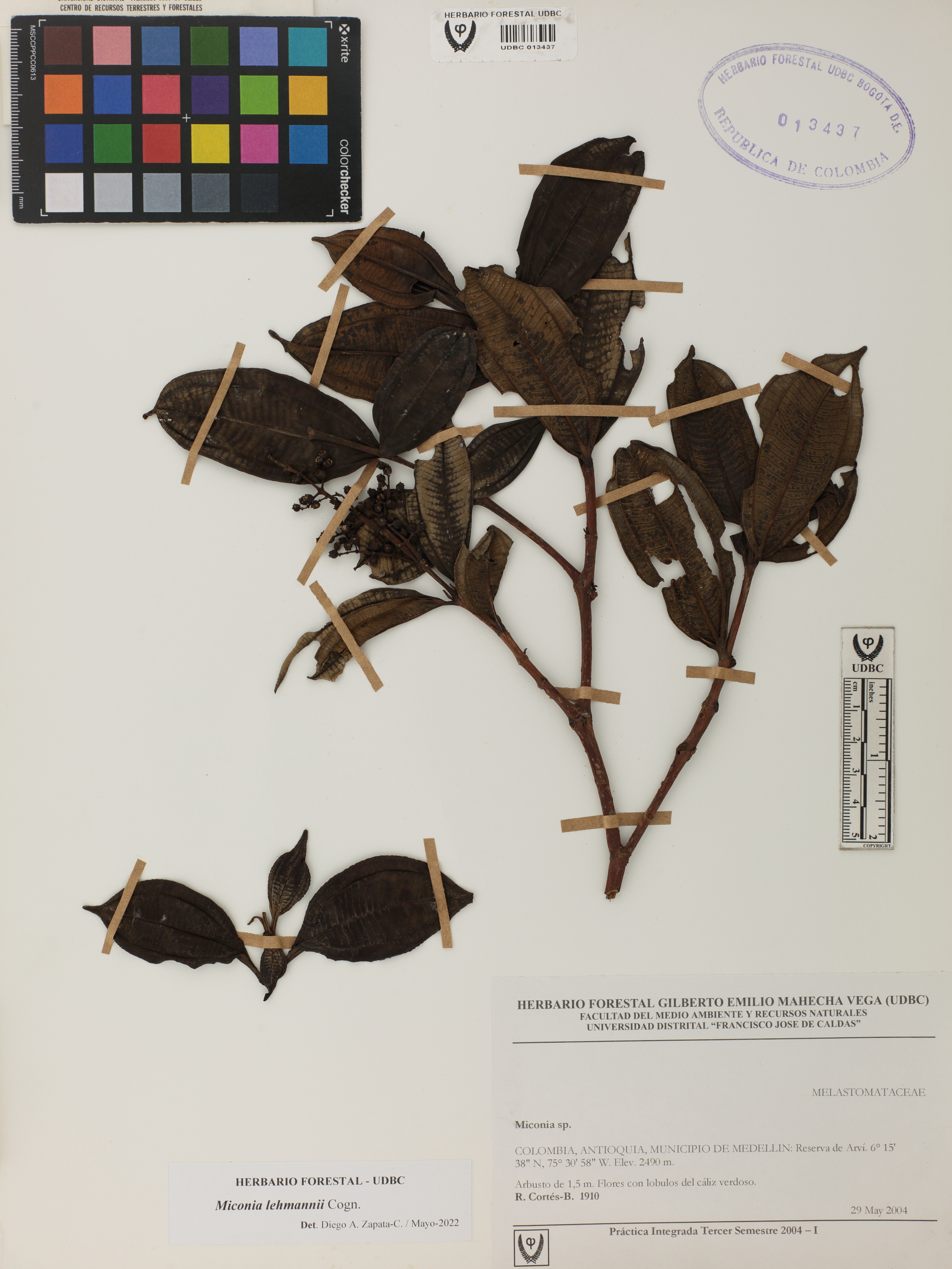 Fotografía del ejemplar Cortés-B., R. 1910, determinado como Miconia lehmannii en el año 2022