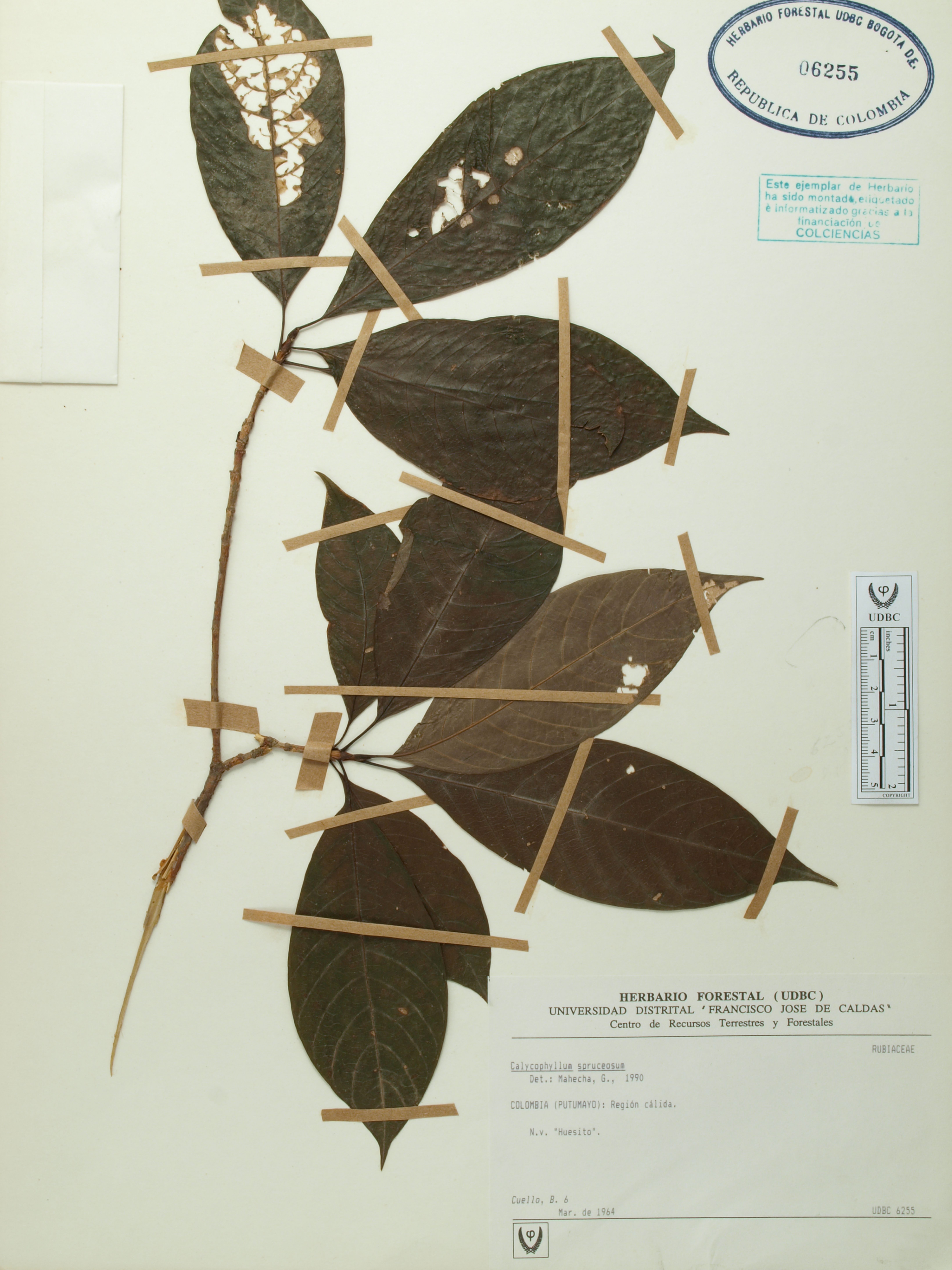 Fotografía del ejemplar Cuello, B. 6, determinado como Calycophyllum spruceanum en el año 1990