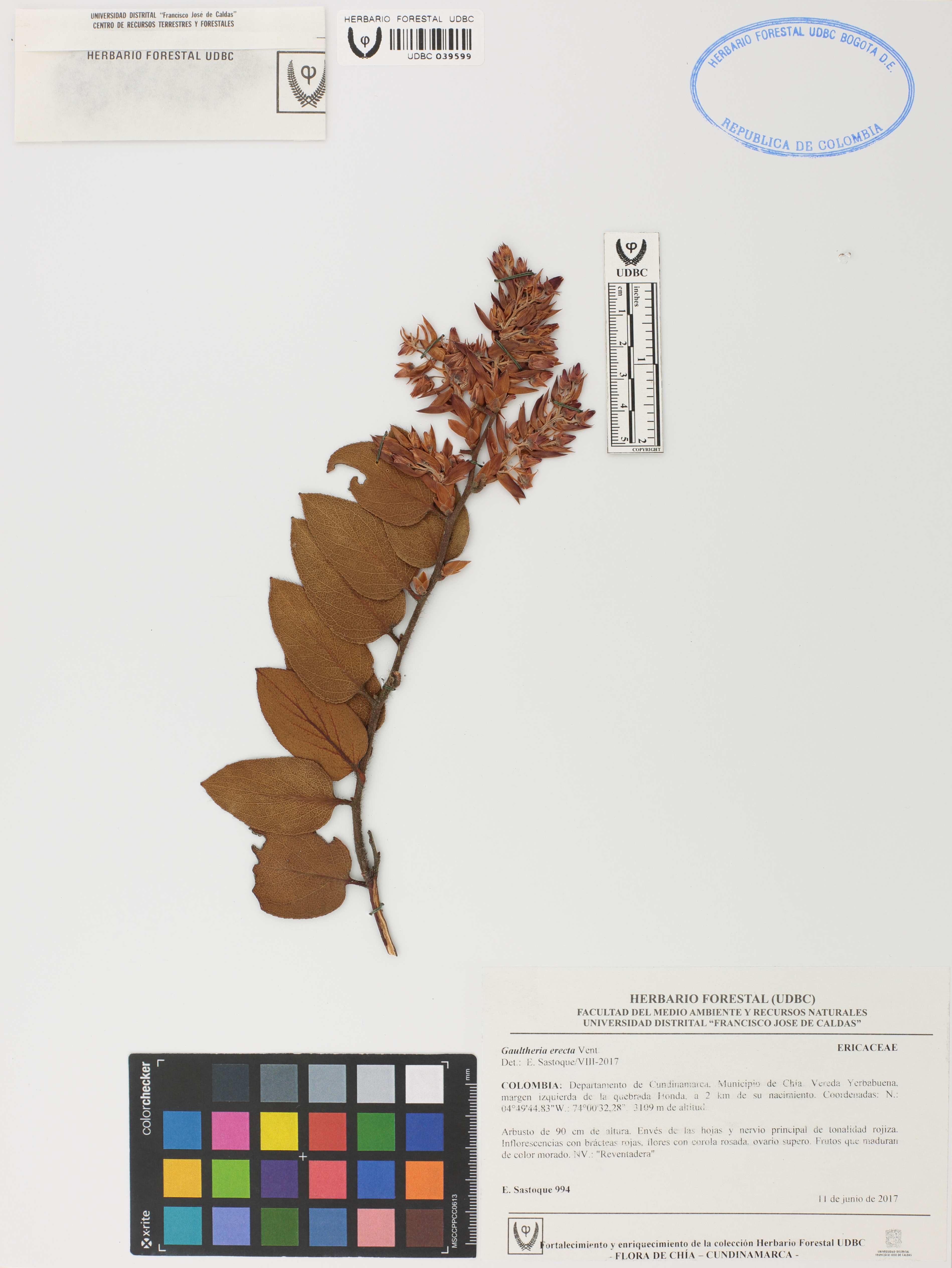 Fotografía del ejemplar Sastoque, E. 994, determinado como Gaultheria erecta en el año 2017