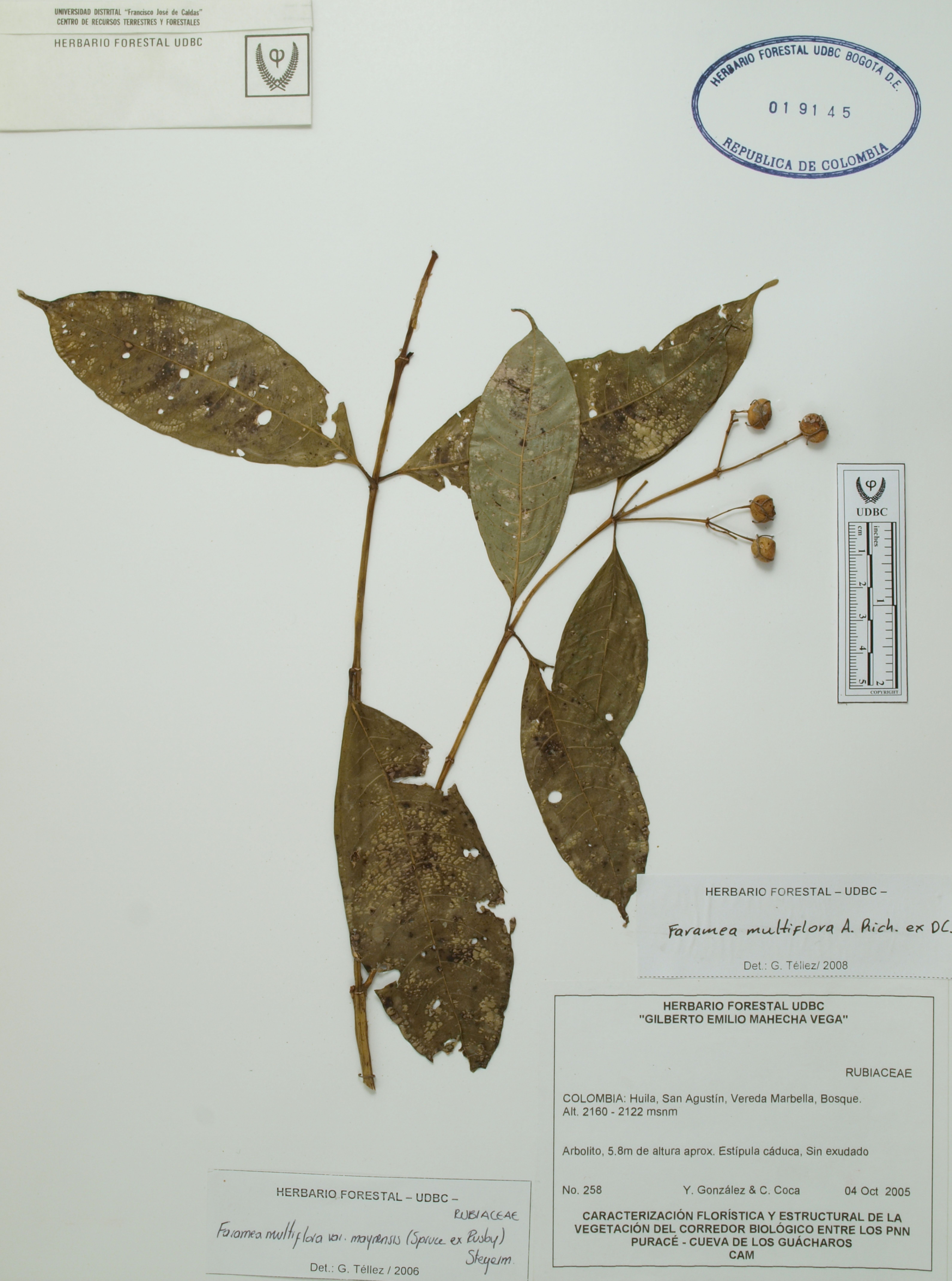 Fotografía del ejemplar González, Y. 258, determinado como Faramea multiflora en el año 2008