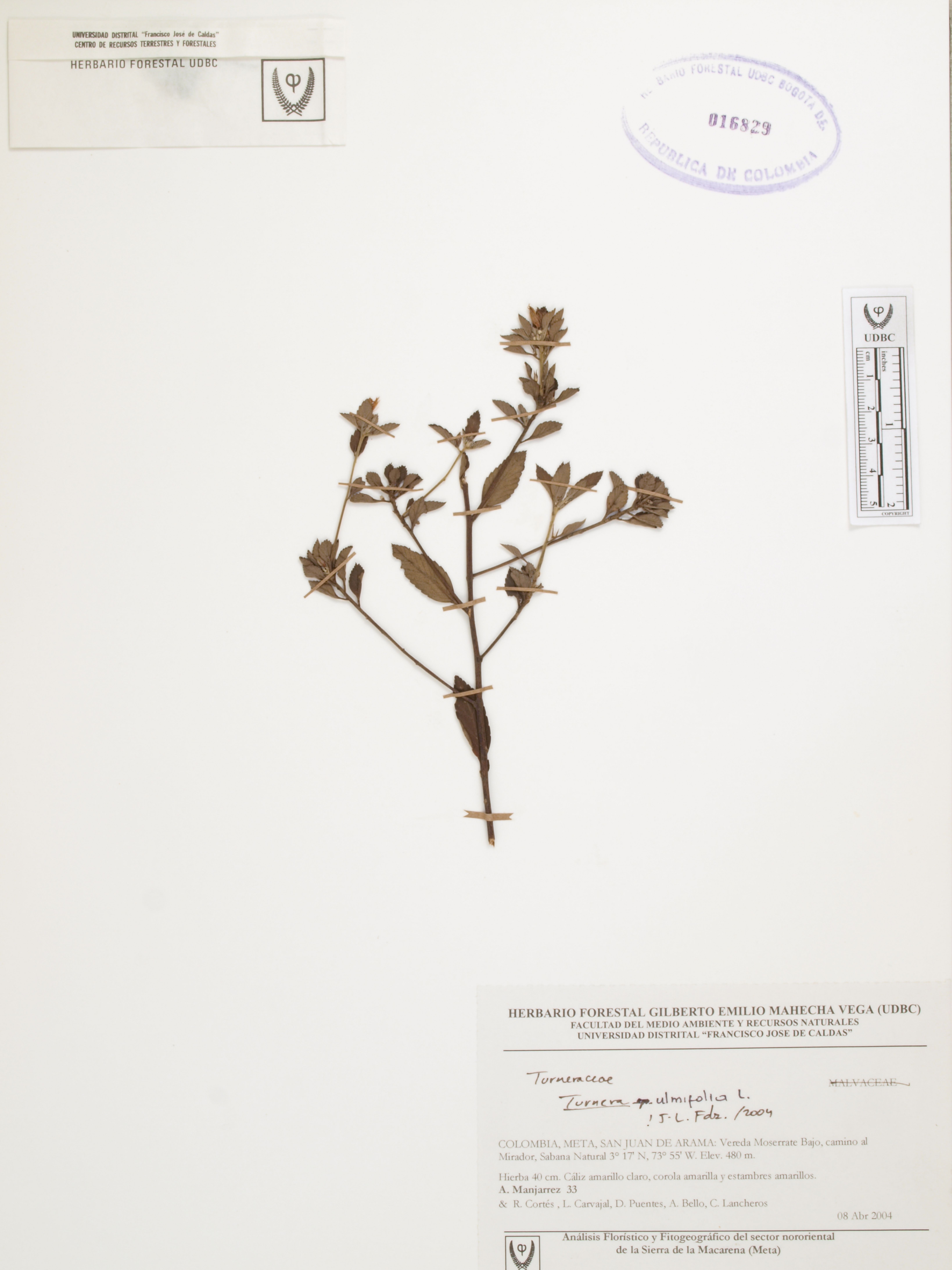 Fotografía del ejemplar Manjarrez, A. 33, determinado como Turnera ulmifolia en el año 2004