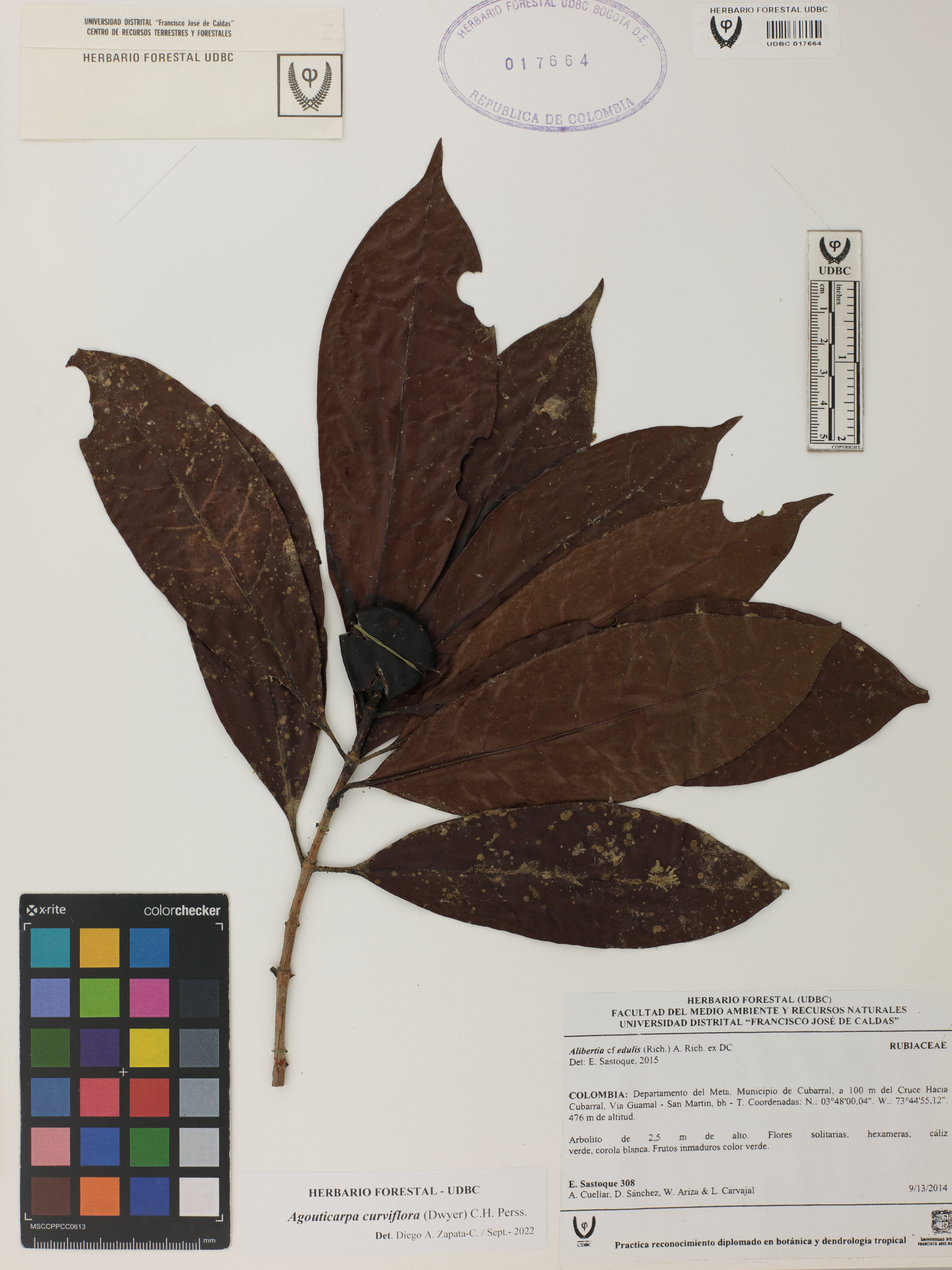 Fotografía del ejemplar Sastoque, E. 308, determinado como Agouticarpa curviflora en el año 2022