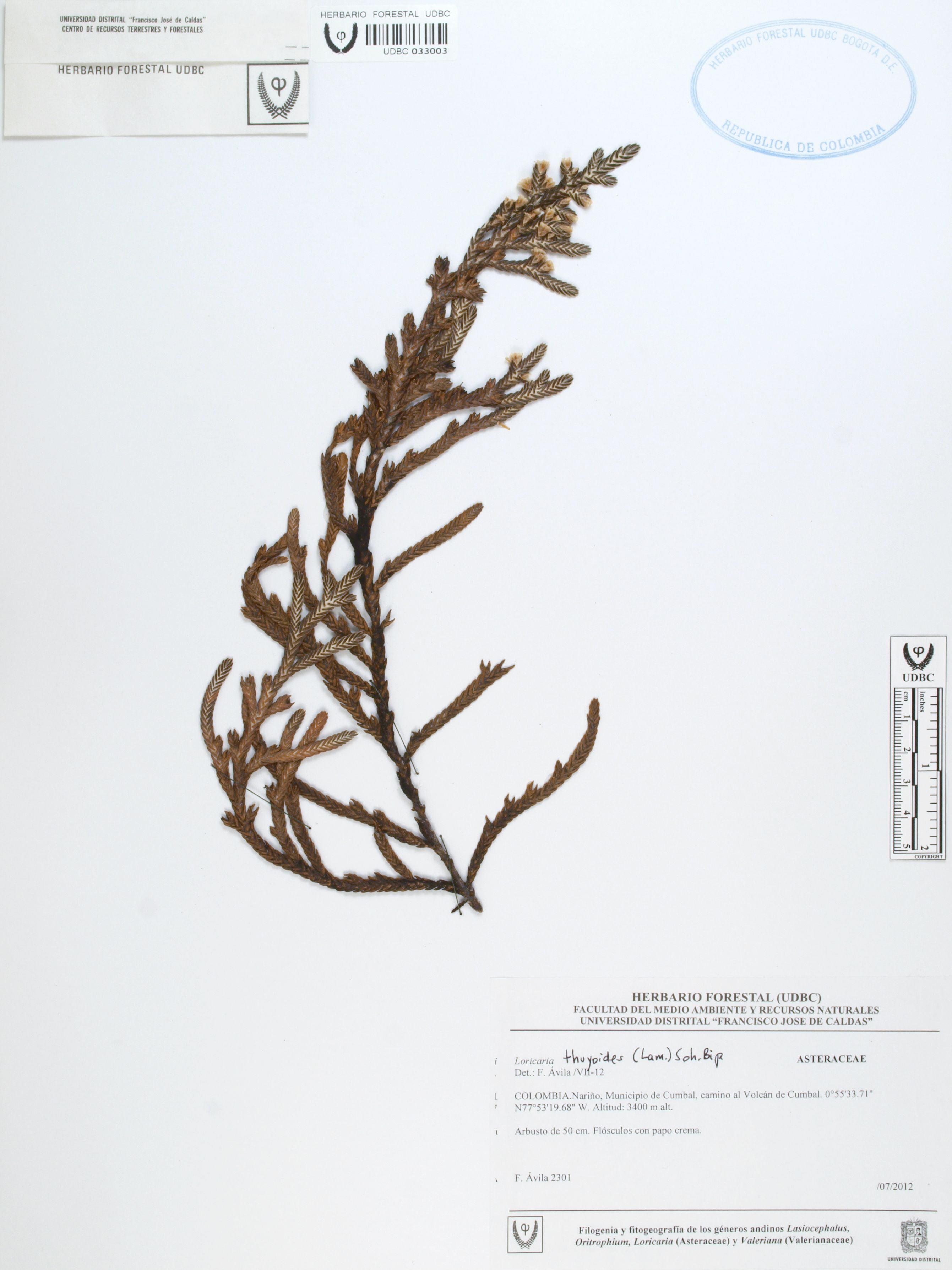 Fotografía del ejemplar Ávila, F. 2301, determinado como Loricaria thuyoides en el año 2012