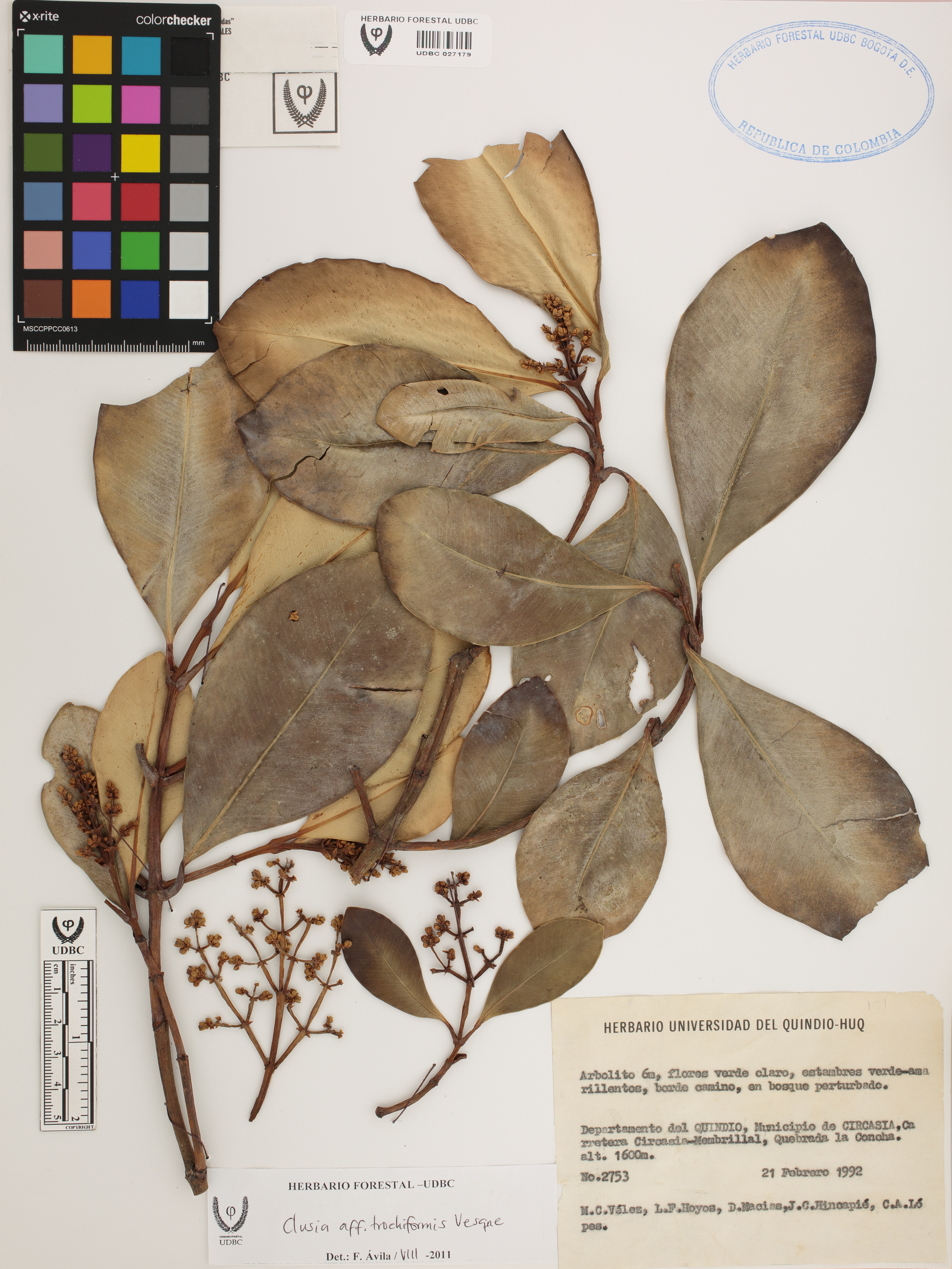Fotografía del ejemplar Vélez, M. 2753, determinado como Clusia trochiformis en el año 2011