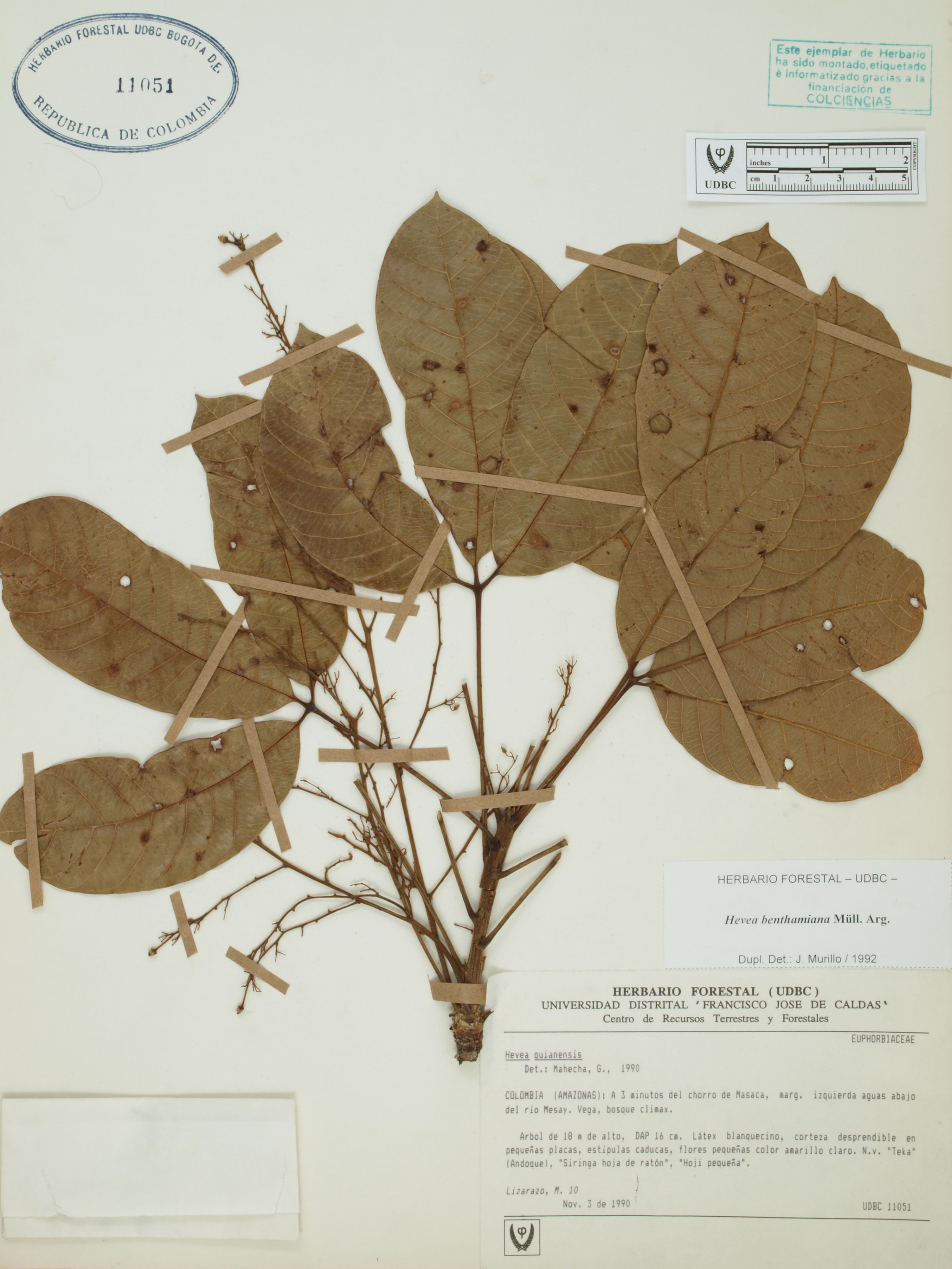 Fotografía del ejemplar Lizarazo, M. 10, determinado como Hevea benthamiana en el año 1992