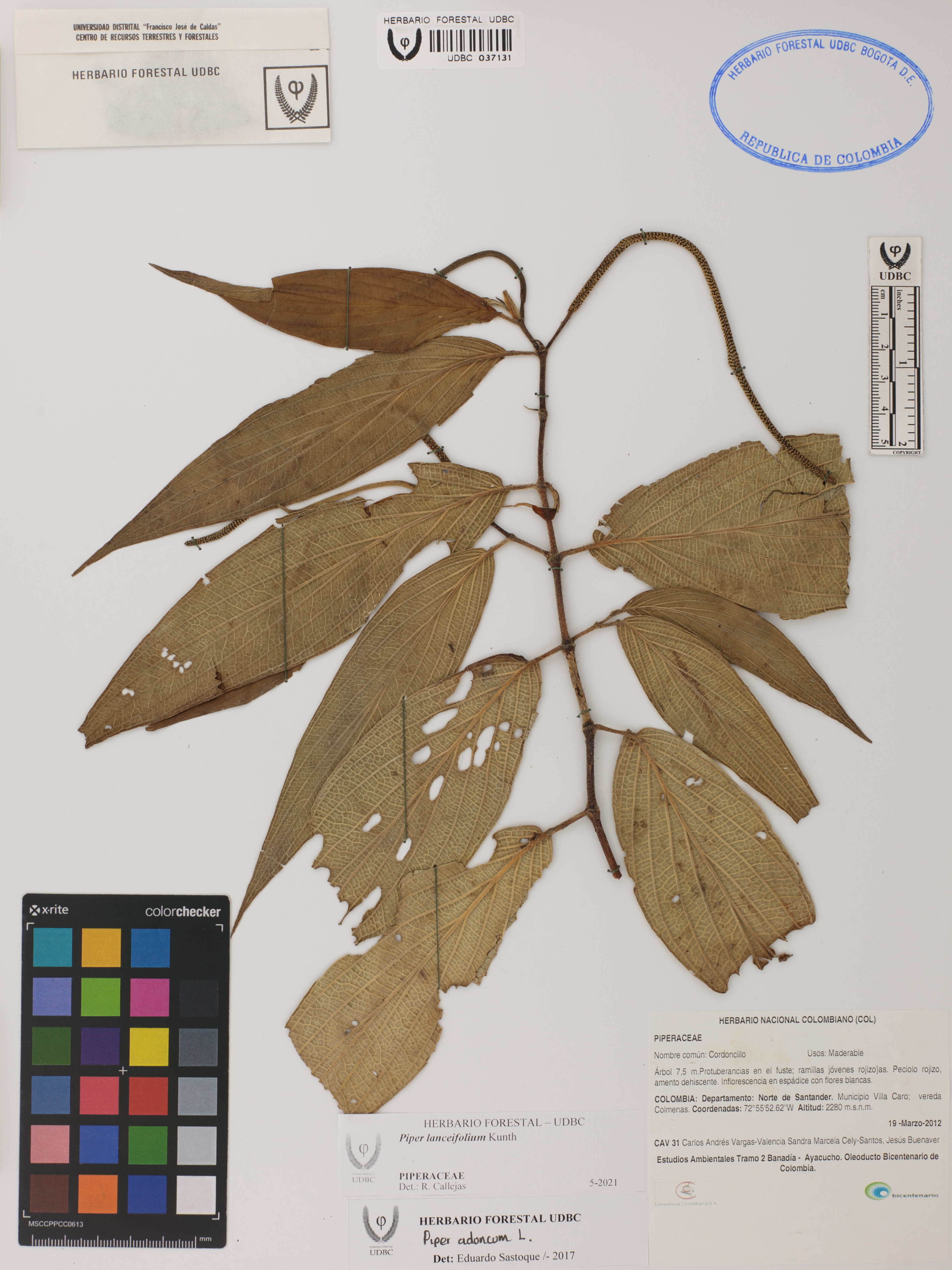 Fotografía del ejemplar Vargas-Valencia, C. 31, determinado como Piper lanceifolium en el año 2021
