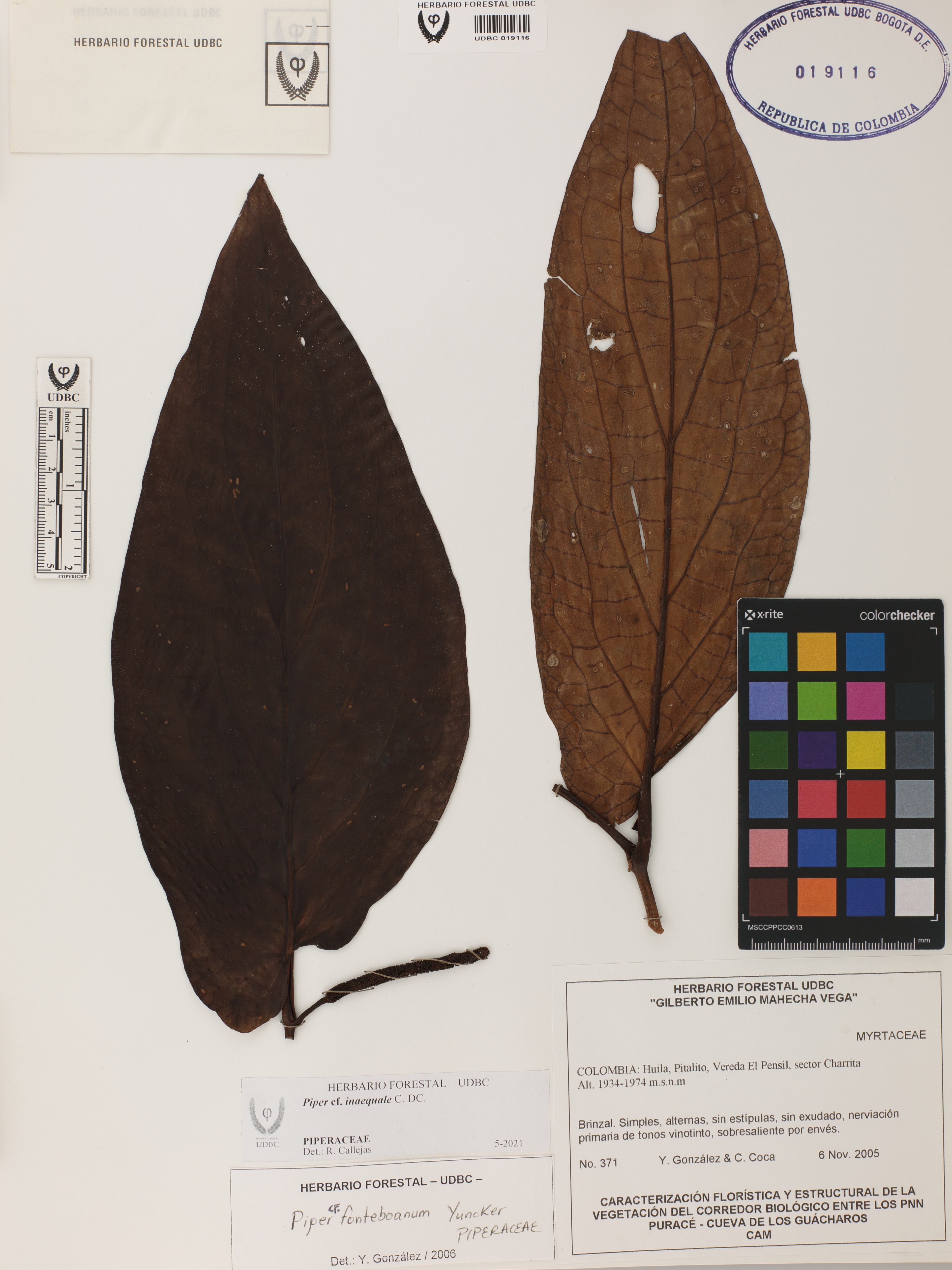 Fotografía del ejemplar González, Y. 371, determinado como Piper inaequale en el año 2021