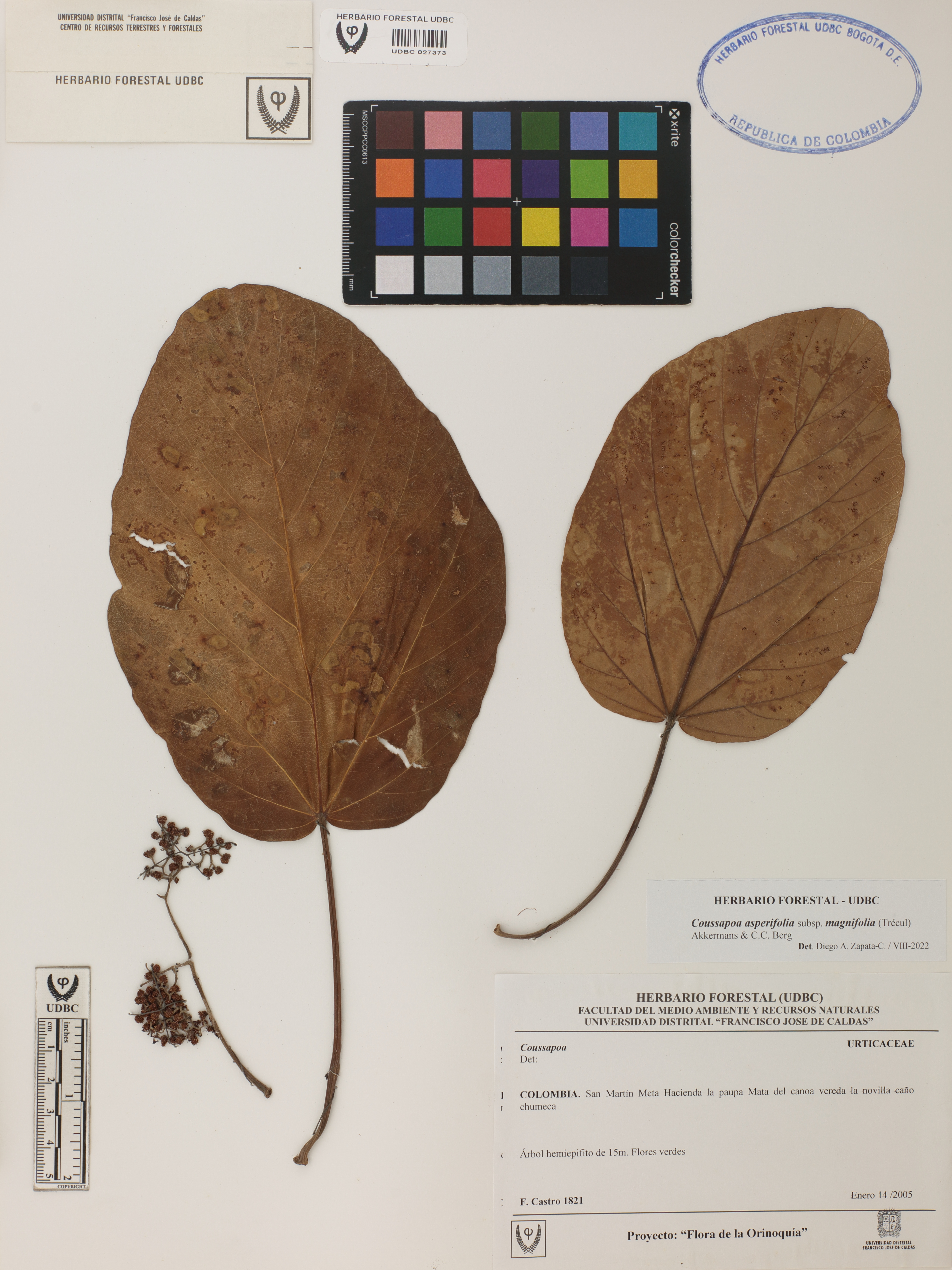 Fotografía del ejemplar Castro, F. 1821, determinado como Coussapoa asperifolia subsp. magnifolia en el año 2022