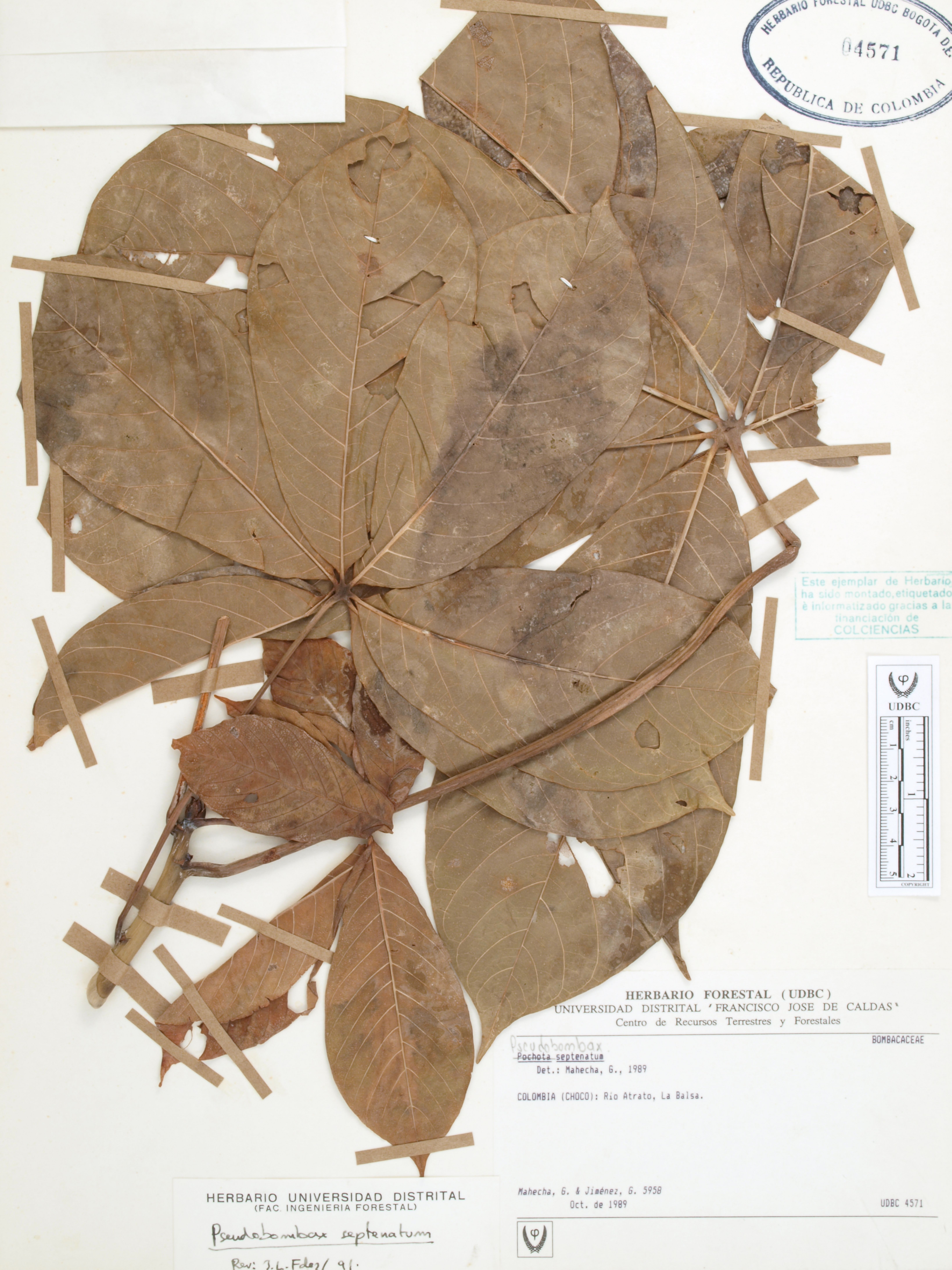 Fotografía del ejemplar Mahecha, G. 5958, determinado como Pseudobombax septenatum en el año 1994