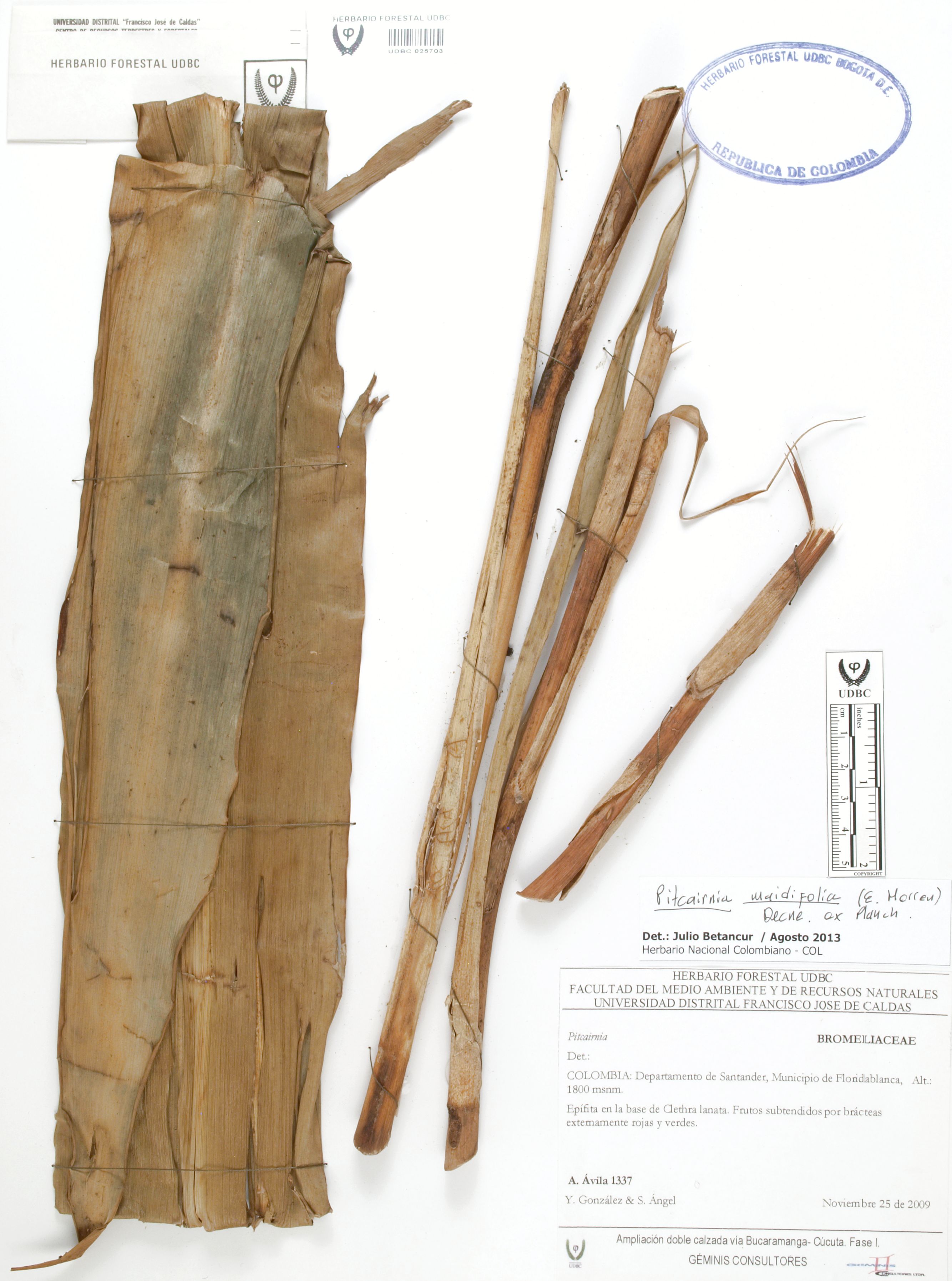 Fotografía del ejemplar Ávila, F. 1337, determinado como Pitcairnia maidifolia en el año 2013