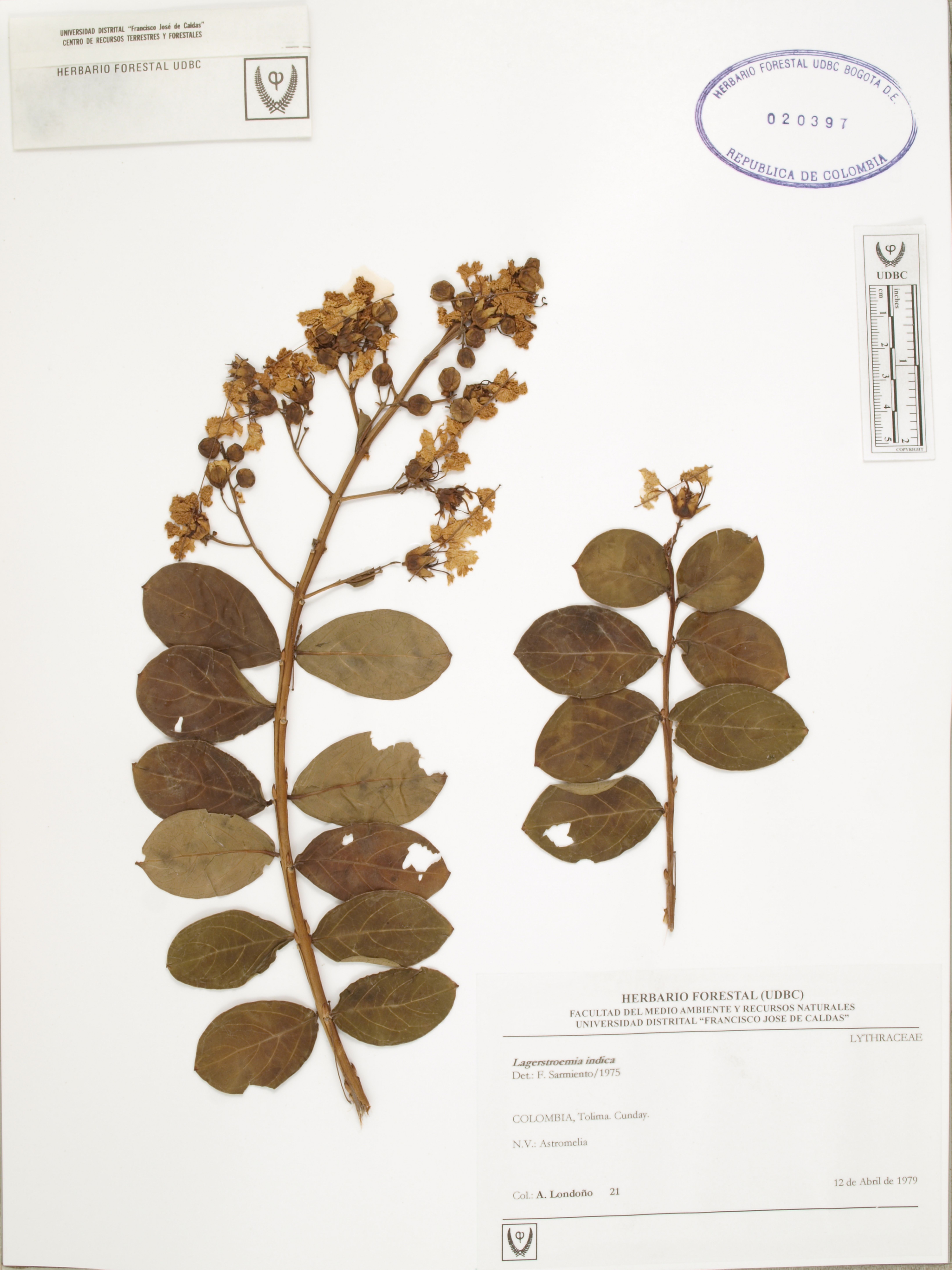 Fotografía del ejemplar Londoño, A. 21, determinado como Lagerstroemia indica en el año 1975