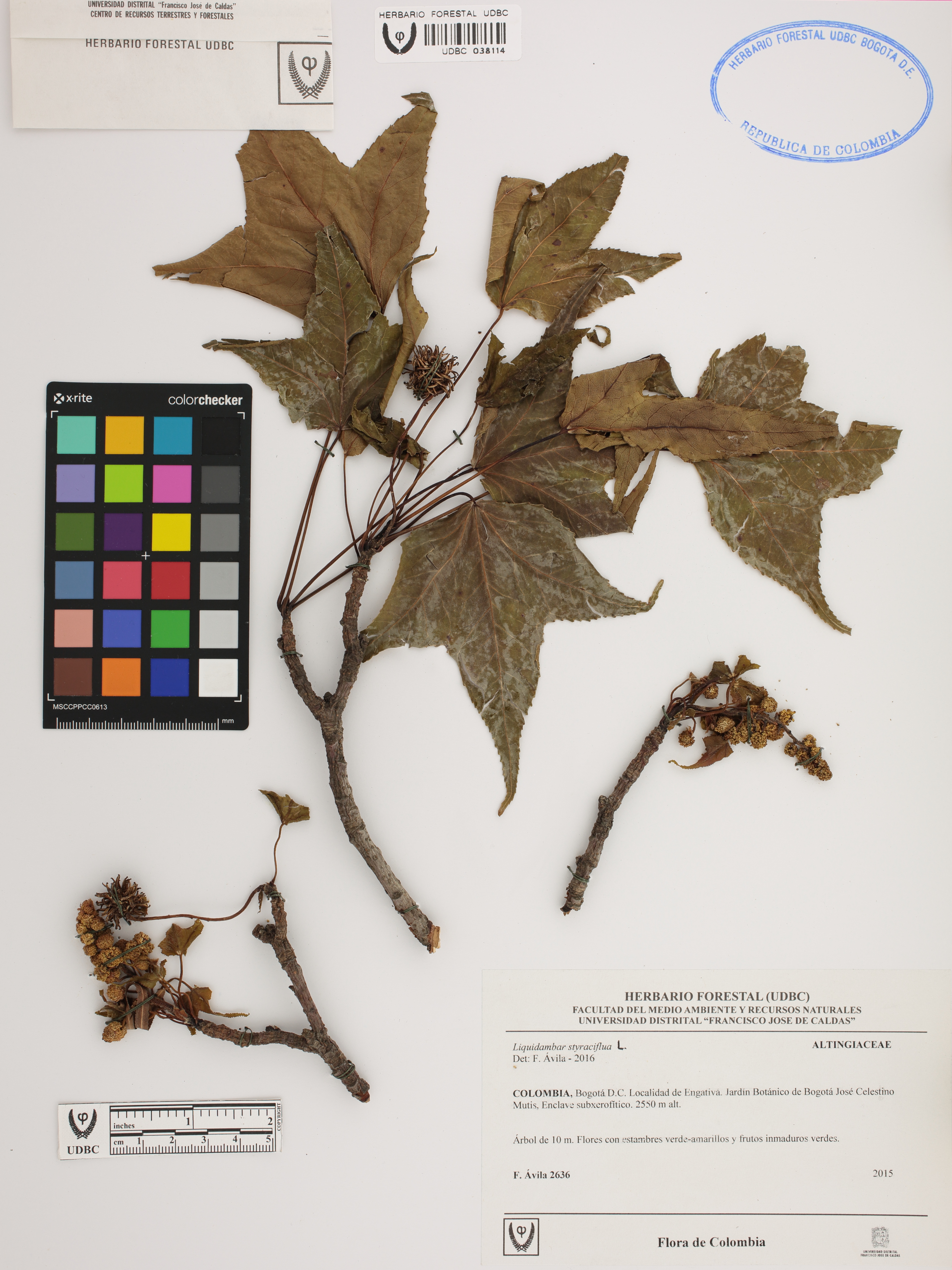 Fotografía del ejemplar Ávila, F. 2636, determinado como Liquidambar styraciflua en el año 2016