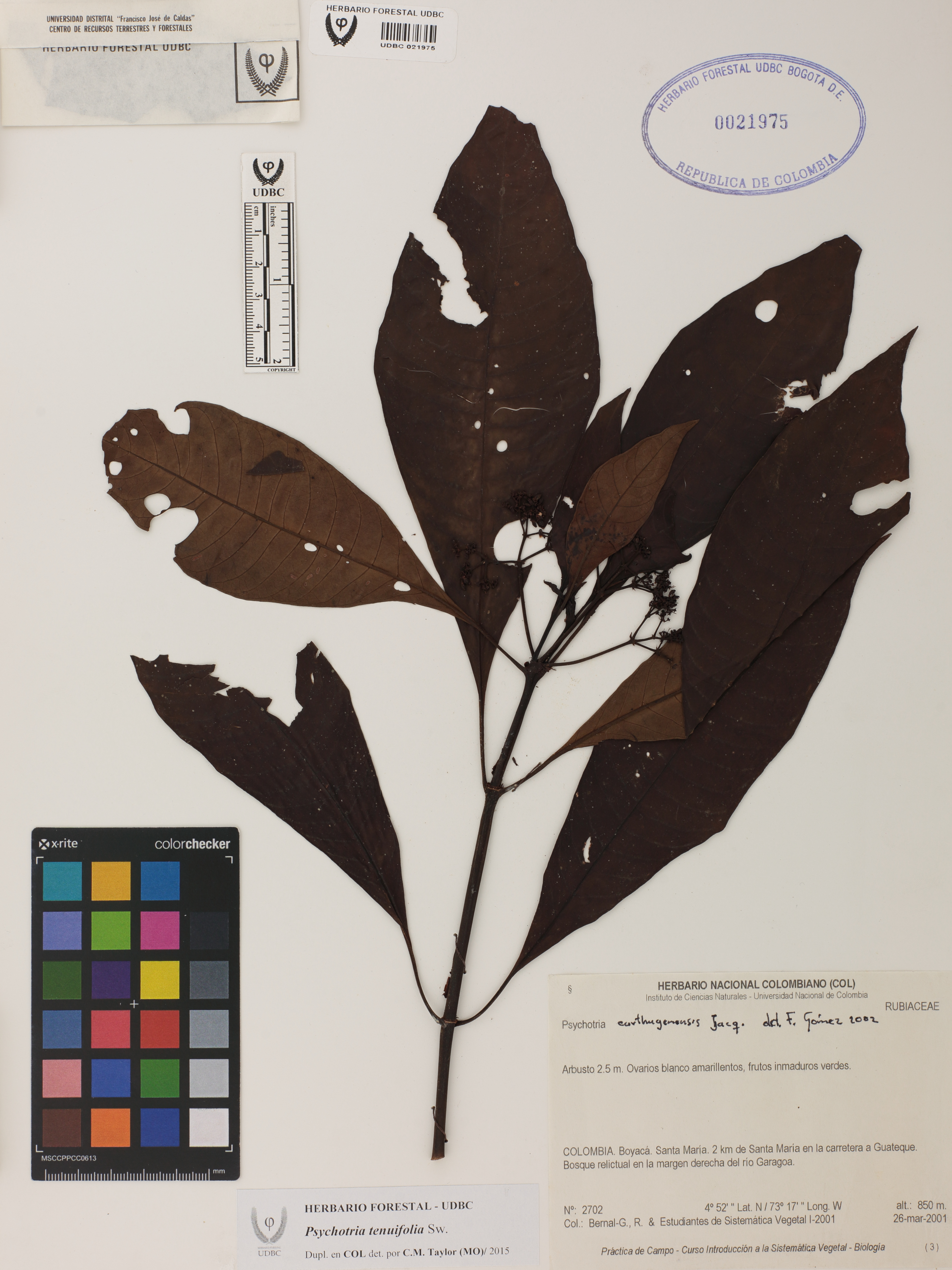 Fotografía del ejemplar Bernal-G., R. 2702, determinado como Psychotria tenuifolia en el año 2015