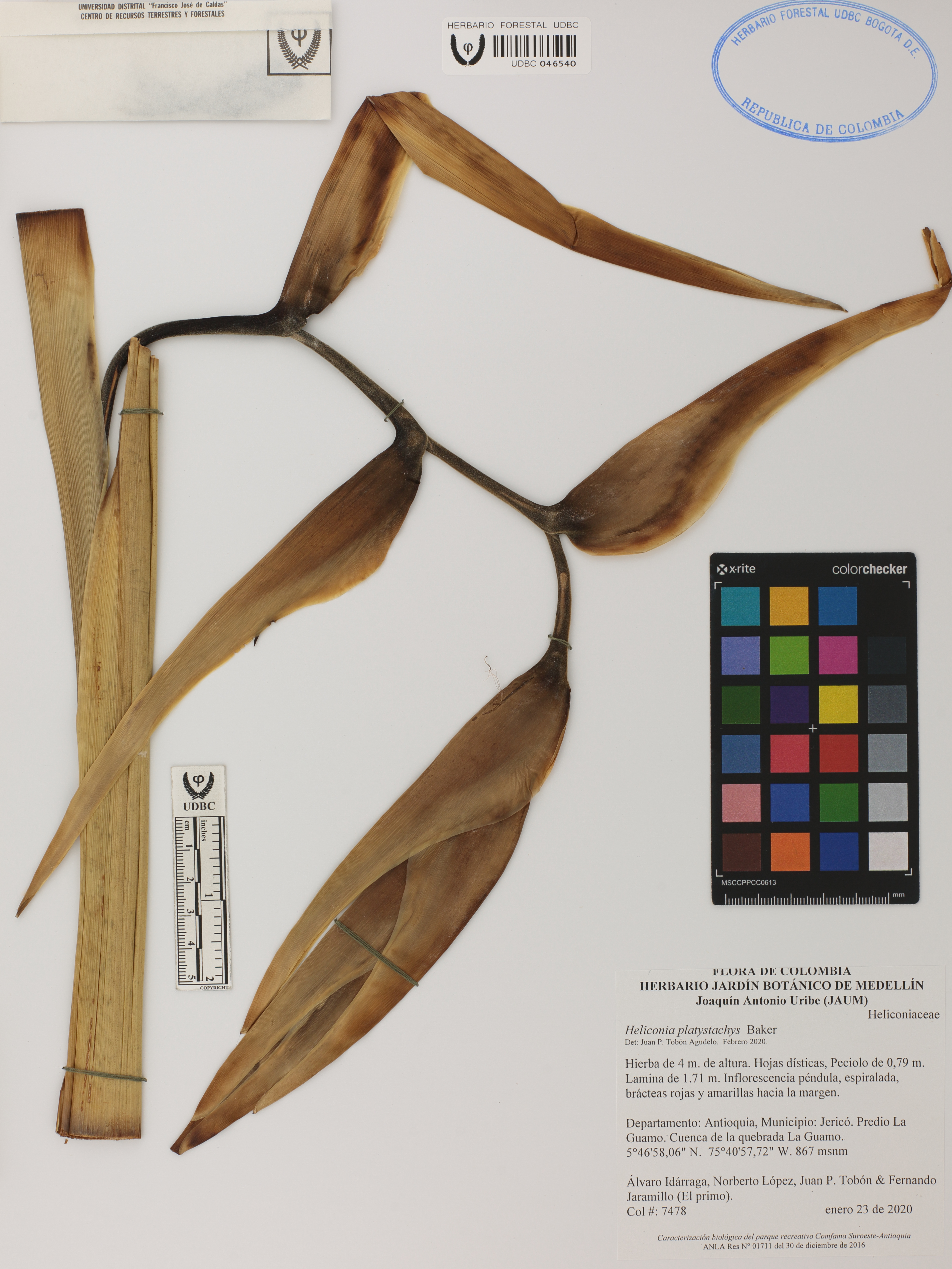 Fotografía del ejemplar Idárraga, Á. 7478, determinado como Heliconia platystachys en el año 2020