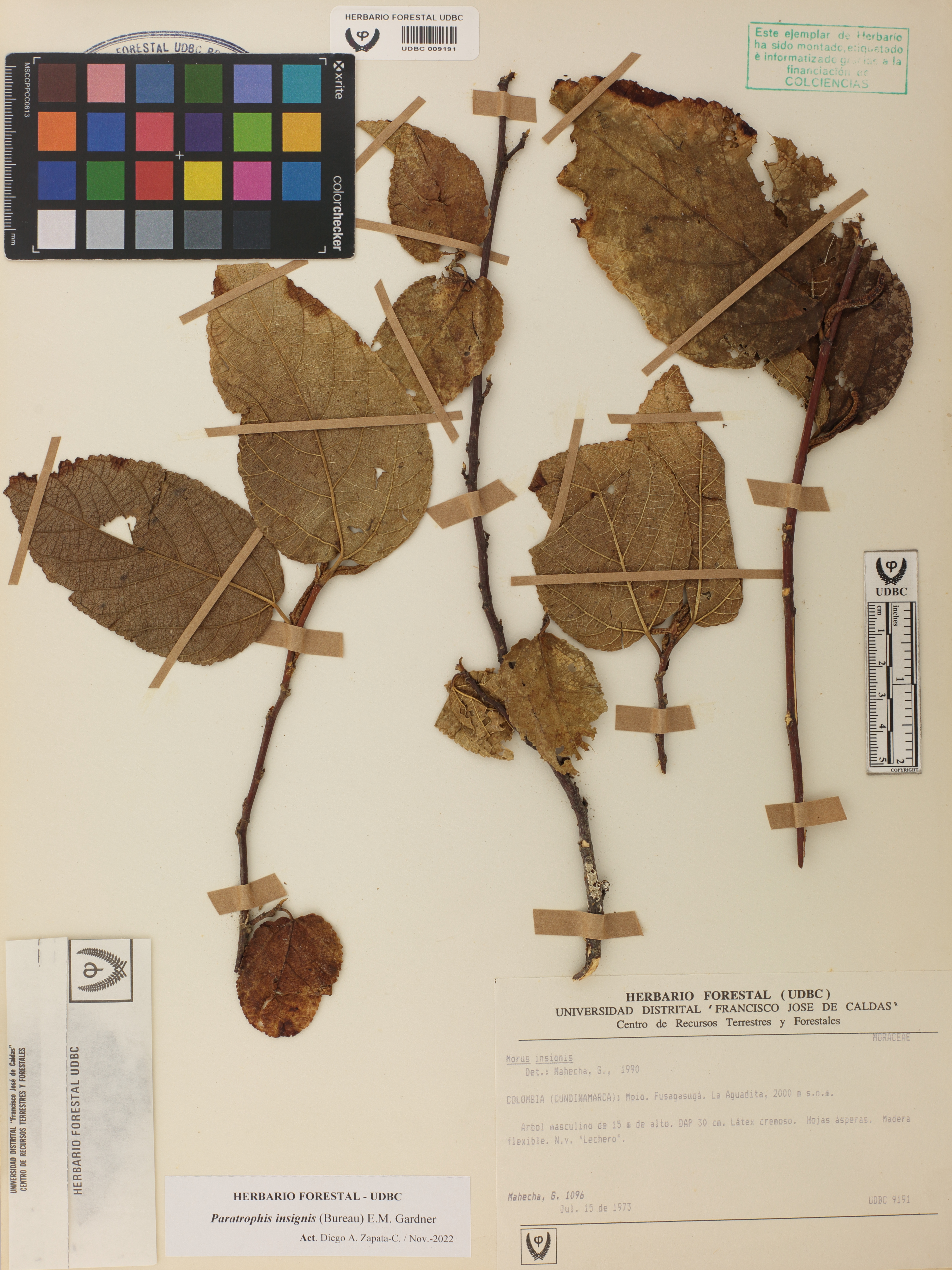 Fotografía del ejemplar Mahecha, G. 1096, determinado como Paratrophis insignis en el año 1990