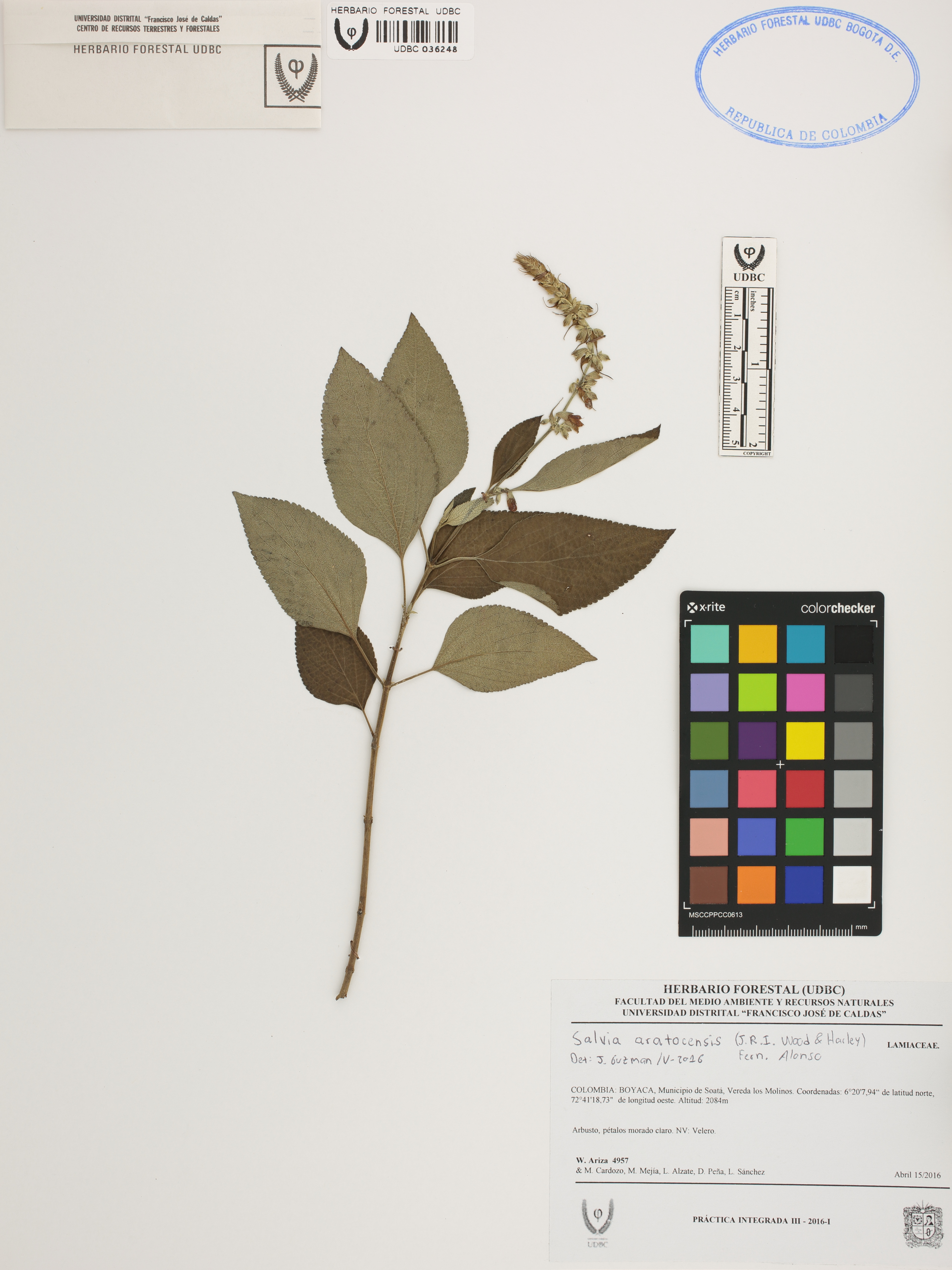 Fotografía del ejemplar Ariza, W. 4957, determinado como Salvia aratocensis en el año 2016
